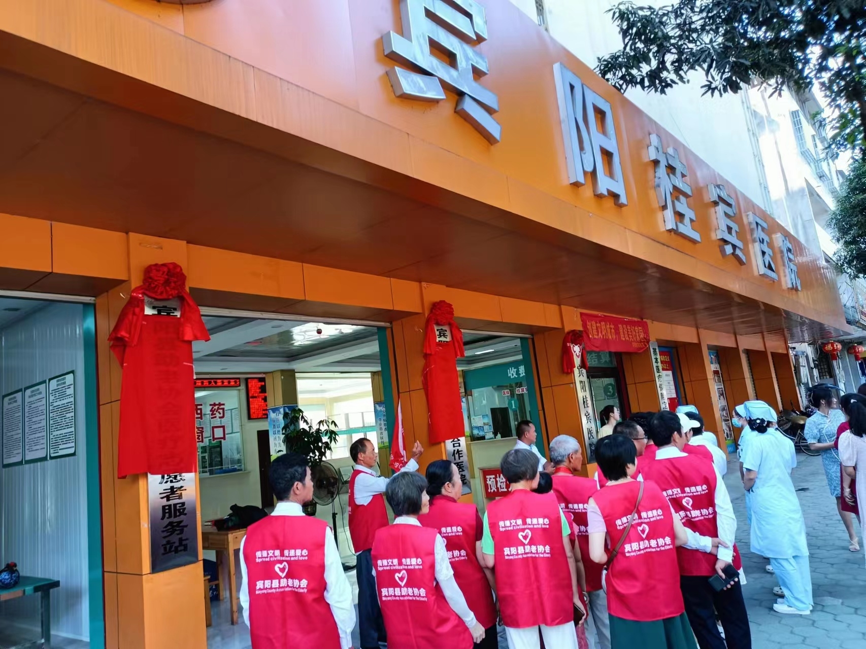 宾阳桂宾医院的地址位于广西南宁市宾阳县宾州镇临浦路467号。早上8点30分宾阳县助老协会的志愿者赶来见证揭牌仪式。