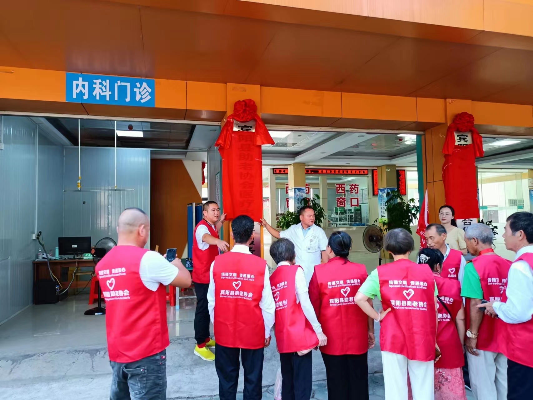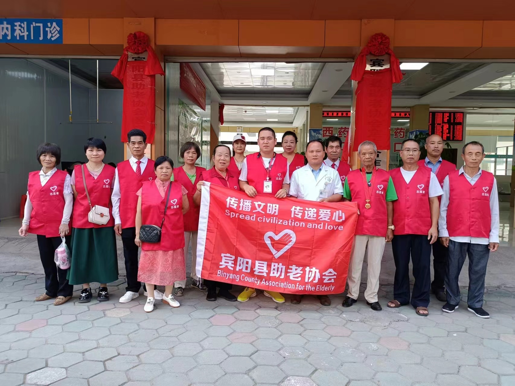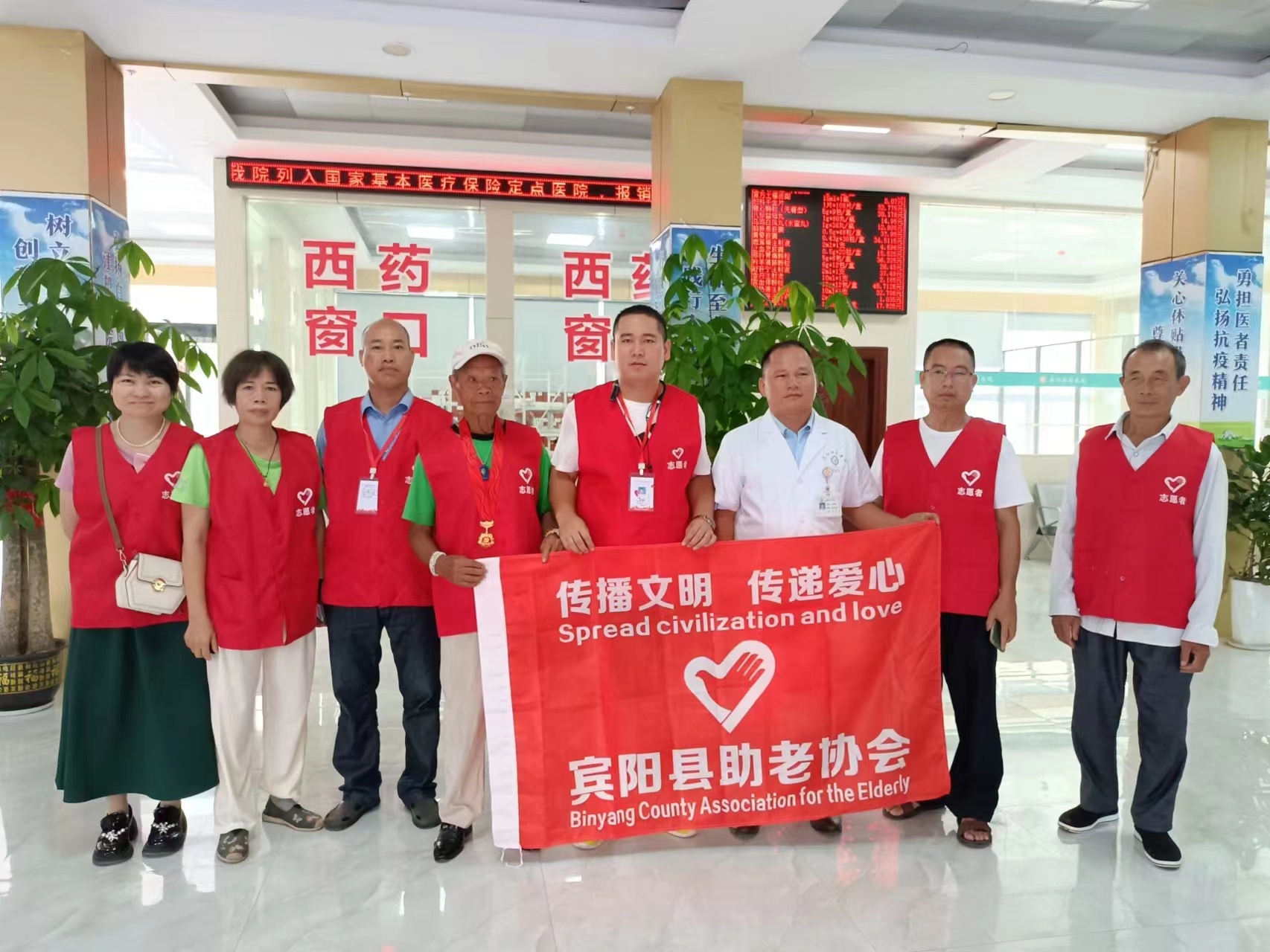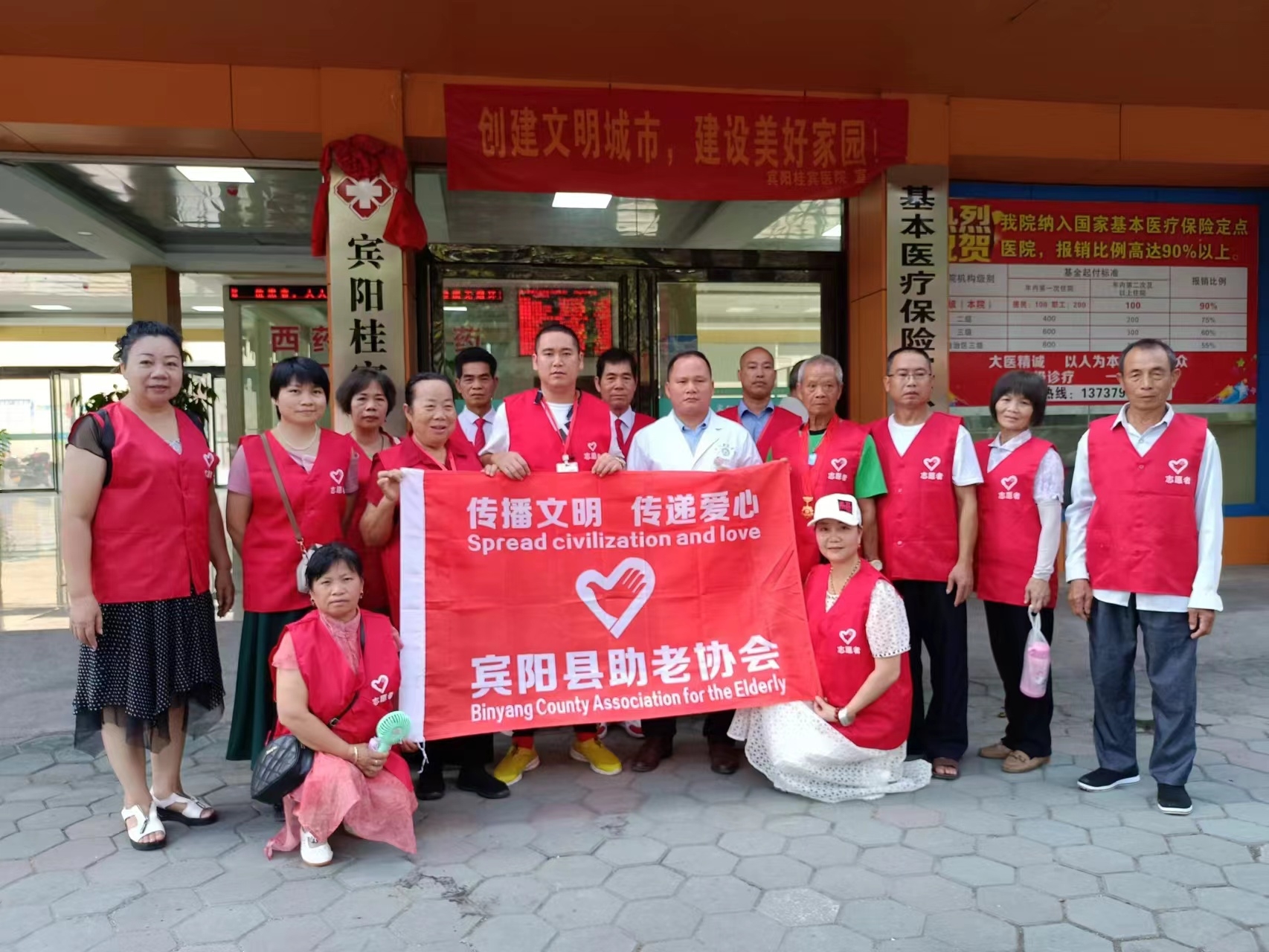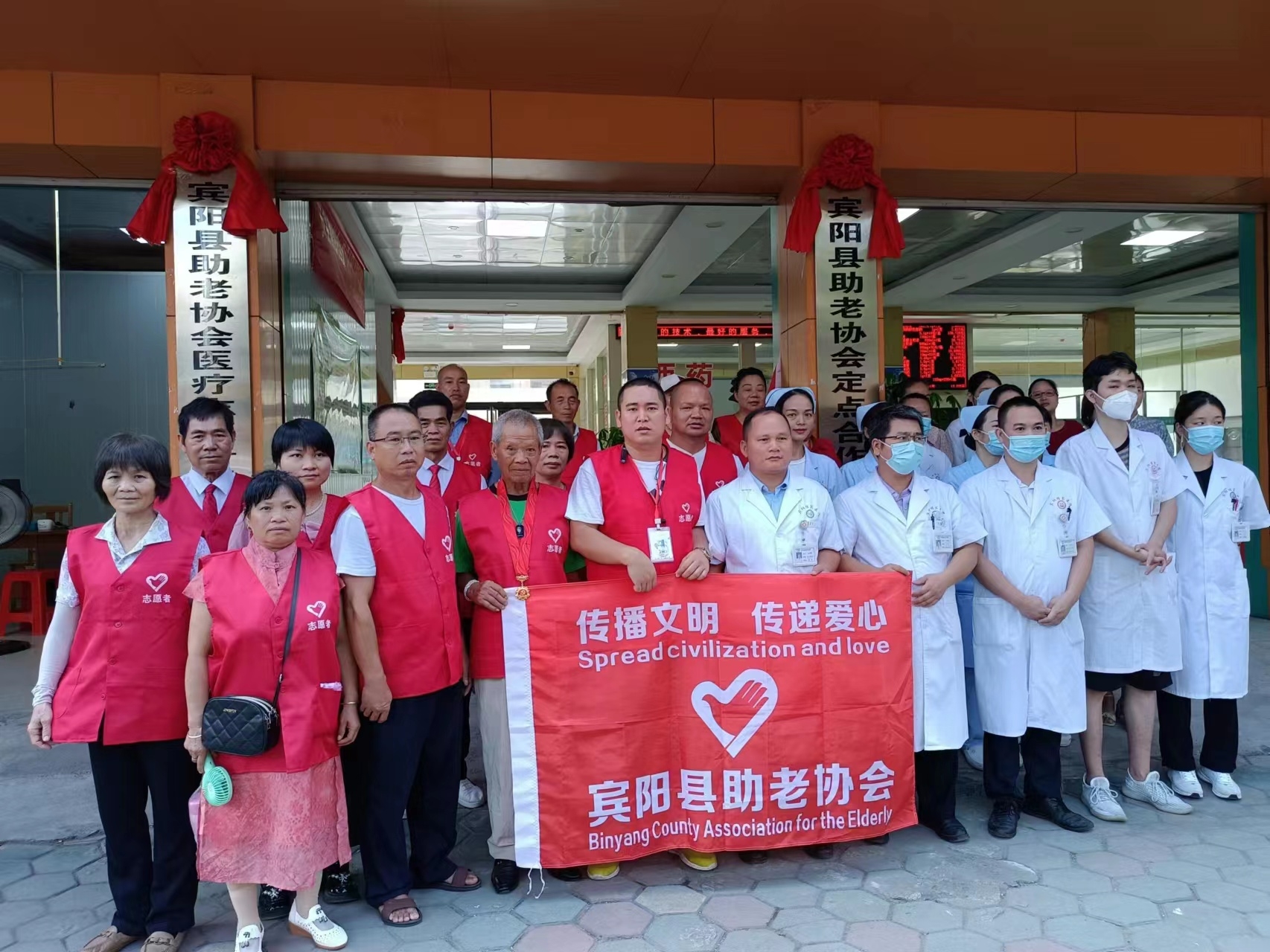 早上9点30分在宾阳县助老协会的理事长:李扬光,宾阳桂宾医院的院长:封安皓,共同揭牌:宾阳县助老协会定点合作医院,宾阳县助老协会医疗志愿者服务站。