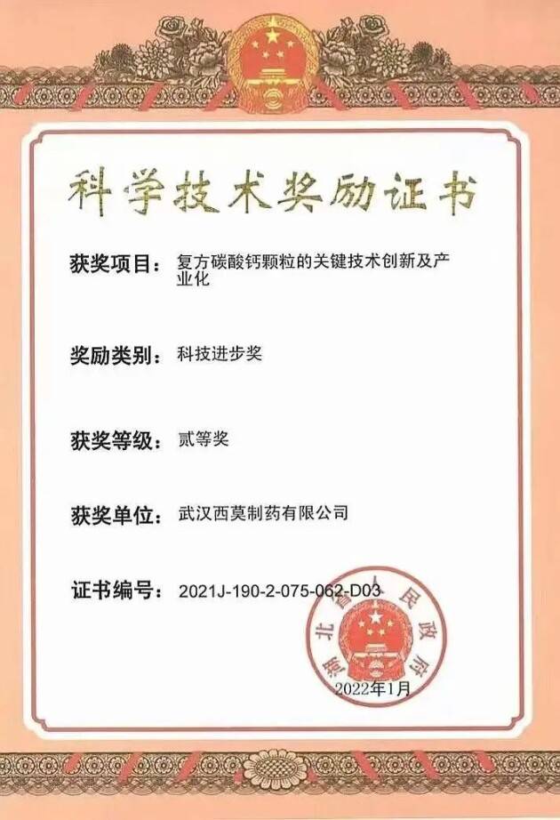 近期,湖北省科技创新大会公布了2021年度湖北省科学技术奖获奖名单,其中武汉西莫制药有限公司(简称)的“复方碳酸钙颗粒的关键技术创新及产业化”项目荣获湖北省科学技术进步奖二等奖,也是2021年湖北省内获奖的唯一创新药企。