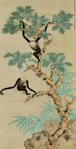 亮点二:主打超值!中国百年艺术“顶流”阵容,今夏罕见作品集合亮相 张大千 檞树双猿 275×107cm 纸本设色 20世纪 中央美术学院美术馆藏