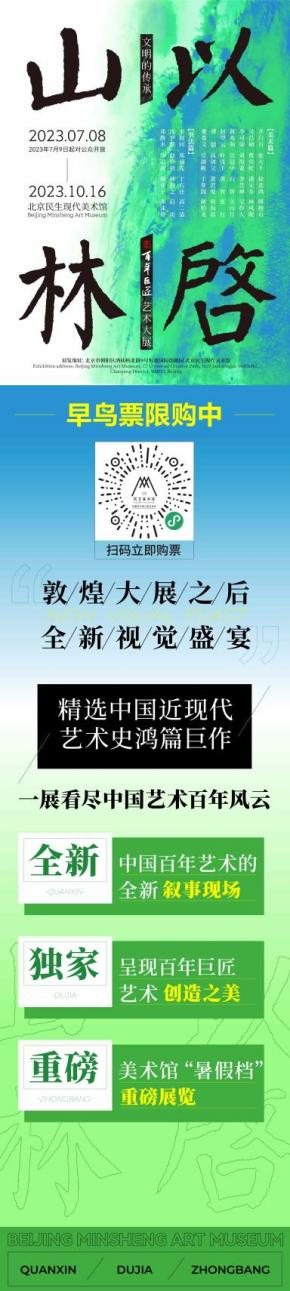 “文明的传承:以启山林—百年巨匠艺术大展”海报 继获评“北京最值得去的展览”第一名——“文明的印记:敦煌艺术大展”后,北京民生现代美术馆将于2023年7月8日--10月16日推出又一重量级展览“文明的传承:以启山林—百年巨匠艺术大展”。该展是民生美术馆文明系列大展之“文明的传承”篇,同时也是备受关注的暑假档文化大展,展览自7月9日起将正式对公众开放。 展览缘起于民生银行独家赞助的《百年巨匠》大型纪录片,已成为文化领域最高端的现象级品牌之一,受到各界人士的广泛赞誉。展览由中国国家图书馆、中央美术学院、中国国家画院、湖南博物院、沈阳故宫博物院、浙江省博物馆、北京画院、北京市文物交流中心、马鞍山市林散之艺术馆、吴作人国际美术基金会、平湖市李叔同纪念馆、荆州博物馆、北京民生现代美术馆、民生书法艺术馆、上海民生现代美术馆、北京民生中国书法公益基金会、北京民生文化艺术基金会、上海民生艺术基金会联合主办。 亮点一:非常新鲜!规模宏大的近现代艺术大师专题展