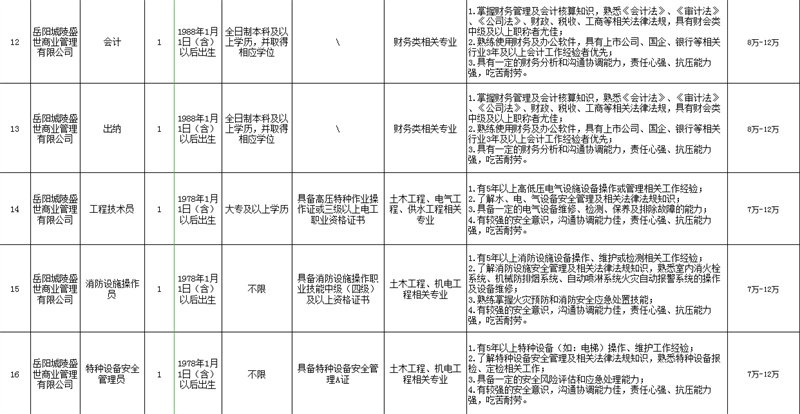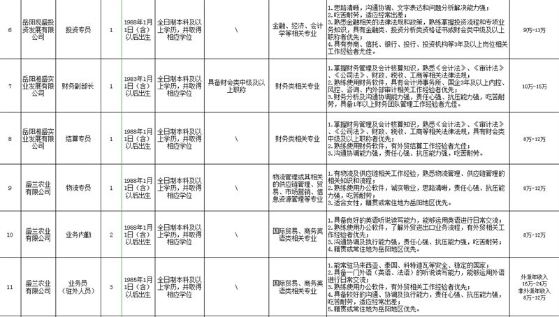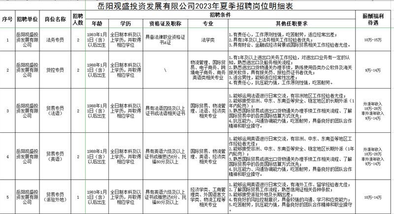 2023年夏季招聘公告 根据战略规划及业务发展需要,岳阳城陵矶综合保税区区属国有企业岳阳观盛投资发展有限公司及其下属管理企业(岳阳湘盛实业发展有限公司、盛兰农业有限公司、岳阳城陵盛世商业管理有限公司)决定面向社会进行公开招聘。公司将竭力提供五险两金、绩效奖金、免费工作餐、员工宿舍(单人间/双人间)、通勤班车、带薪年假、“七节一生日”消费券、职业培训、免费健康体检等福利待遇,诚邀广大优秀应届毕业生及具有工作经验的求职者携手共创美好未来!现就有关事项公告如下: 一、招聘岗位及数量 本次计划招聘各类专业人才23名,其中岳阳观盛投资发展有限公司10名,岳阳湘盛实业发展有限公司2名,盛兰农业有限公司6名,岳阳城陵盛世商业管理有限公司5名,根据公司实际需要可适当调整岗位。 二、招聘条件 1.本次招聘面向社会。凡遵纪守法、职业道德良好,且年龄、学历、专业等符合岗位要求的(详见附件:岳阳观盛投资发展有限公司2023年夏季招聘岗位明细表),均可报名参加。 2.有下列情形之一的人员不得报名应聘: (1)曾因犯罪受过刑事处罚或曾被开除公职、开除党籍、开除学籍的人员;尚未解除党纪、政务处分或正在接受纪律审查、监察调查的人员;涉嫌违法犯罪正在接受司法调查尚未作出结论的人员; (2)列入失信被执行人名单或征信有不良记录的人员。 三、招聘程序 (一)报名 1.报名时间:2023年7月5日至2023年7月23日。 2.报名方式:网络报名。通过指定报名链接(https://jinshuju.net/f/sIvXRO)进行报名,报名确认以后,报考岗位和填报上传的信息、材料均不得在网络报名系统修改。 3.报名材料:近期1寸免冠彩色证件照、身份证正反面扫描件、第一学历至最高学历毕业证、学位证、学信网电子注册备案表(登陆中国高等教育学生信息网https://www.chsi.com.cn/)或国家教育部留学服务中心国外学历学位认证书、专业技术职称、职(执)业资格证书、获奖证书等证明材料上传至指定报名链接中。 4.注意事项 (1)应聘者只能选择一个岗位报名,须慎重选择岗位; (2)应聘人员必须诚信报考,如实填报、上传个人相关信息和材料,确保信息和材料合法合规、真实有效。伪造、涂改证件、证明等报名材料,或者以其他不正当手段获取应聘资格的;提供的涉及报考资格的材料或者信息不实,且影响报名审核结果的;一经查出取消应聘资格,已录用的取消录用,由应聘人员自行承担取消应聘资格及录用的后果; (3)应聘者不得有违法犯罪情形,一经查出取消应聘资格,已录用的取消录用; (4)应聘者报名与考试时使用的身份证必须一致; (5)应聘者须按照招聘岗位各项条件要求一一对应填写,专业名称须与本人毕业证一致,未按要求填写,或因错、漏、改、增字造成审核不合格的,由应聘者自行承担取消应聘资格的后果; (6)应聘者出现故意浪费招聘资源的不诚信行为,如面试后进入体检、考察、公示等环节后放弃的,又未在进入体检、考察、公示等环节前提交放弃说明的;以及办理聘用手续时放弃的均记入诚信档案,3年内不得参加岳阳观盛投资发展有限公司及其下属管理企业组织的公开招聘。 (二)资格审查 严格按照公布的岗位条件对应聘者的相关信息进行资格审查,择优通过。符合条件的报考人员将通过电子邮件、手机短信等形式通知进入下一流程。资格审查贯穿于整个招聘工作,经发现并查实报考人员提供虚假信息或不符合报名条件者,立即取消其应聘资格,签订了劳动合同的应解除劳动合同。 (三)面试 面试分为初试和复试。 1.初试 (1)初试分为线上视频面试或现场面试(线上面试为主),时间、地点和方式通过电子邮件、手机短信提前通知; (2)初试开考比例:各岗位原则上按招聘计划数与符合报名条件人数的比例须达到1:3(含)方可开考,若未达到开考比例要求,可根据实际情况按程序报批后取消、核减相应岗位招聘计划或降低开考比例,也可以修改报名条件、延长报名时间。岗位计划取消的,报考人员可申请改报一次符合条件的其它岗位。 2.复试 (1)复试开考比例:根据初试成绩从高分到低分进行排名,按招聘计划数,以不低于1:3且不高于1:4的比例确定入围复试人选(最后一名若初试成绩相同者一并入围); (2)复试采取现场面试形式(因特殊情况不能来现场视同放弃),时间、地点通过电子邮件、手机短信提前通知,并对参与复试且符合报销条件人员的交通及住宿费用予以报销。 (四)体检 根据招聘计划数1:1的比例,按面试最终总成绩由高分到低分进行排名确定入围体检人选;体检具体时间及地点另行通知,体检不合格者不予录用。体检标准参照《公务员录用体检通用标准(试行)》和相关规定实施,安排到指定的医院进行体检并报销体检费用,参加体检的交通费、住宿费自理。 (五)考察 体检合格人员才能进入考察环节,考察时间及安排另行通知,主要考察报考人员的思想政治表现、道德品质、业务能力、工作实绩等情况,并对报考人员资格条件进行复审。组织考察时,根据考察对象的情况采取适当的考察方式,并形成具体的考察结论。 (六)公示 1.根据考试、体检、考察结果研究确定拟聘人员名单,在岳阳观盛投资发展有限公司官方网站公示(网址链接为:http://www.yyguansheng.com/),公示时间为3个工作日。 2.公示期内无异议或虽有异议但经查实不影响聘用的,由招聘单位确定聘用,并约定