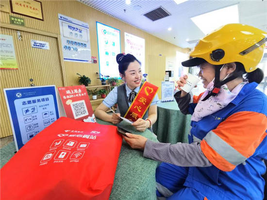 连日来高温持续不下,中国电信淮安分公司水渡广场营业厅爱心翼站,为户外工作者提供纳凉休息、饮水、手机应用辅导、充电、反诈骗知识宣传等服务,为户外工作者送上一份清凉、一份爱心,让这些酷暑中坚守一线的辛勤劳动者真切感受到来自电信人的关怀。图为7月13日, 爱心服务专员为环卫工人送上爱心翼站防署降温礼包。
