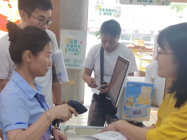 图2:负责人为团队成员展示、讲解商品上的“浙食链”相关信息 在“浙食链”的全链建设如火如荼地开展之时,拱墅区作为社零消费全省第一区,成为“全球二维码迁移计划”(GM2D)先行试点区域之一,拱墅区的联华超市成为了全球首家实现二维码结算的连锁经营企业。负责人在收银台向我们展示了一维码结算、二维码溯源整合打通的成果,并多次提及进一步普及推广商品的二维码结算是商超目前的努力方向。 而后负责人在会议室向我们详细介绍了联华目前在“浙食链”方面的成就和推进历程。他们介绍了联华自行研发的结算码和保质期管控码,可以实现码的高效运用,达到效能方面的“通准快”。在交流的最后,负责人也提到了他们目前面临的难点和痛点:“浙食链”的印刷规范问题、企业成本问题等。