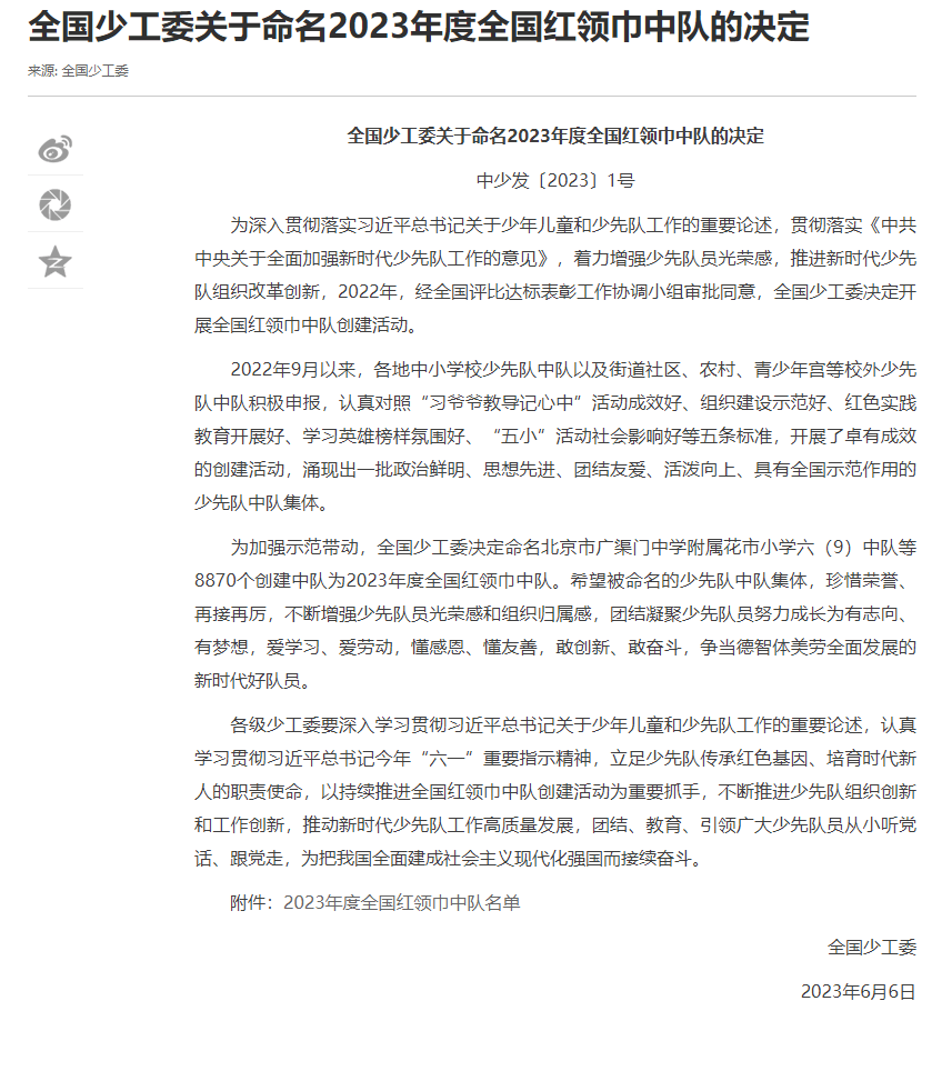 近日,无锡市少年宫少先队七彩梦中队荣获全国少工委命名的2023年度全国红领巾中队称号!这是对无锡市少年宫全体队员辛勤努力和出色表现的最大认可,也是无锡市少年宫共同努力的成果。 在过去的一年里,无锡市少年宫少先队七彩梦中队的每一位队员都积极参与各项活动,展现出了优秀的红领巾精神和团队合作能力。无锡市少年宫在各项比赛和考核中取得了优异的成绩,在地区和全国级别的比赛中脱颖而出。这些成绩的取得离不开每一位队员的努力和奉献,也离不开家长的支持和鼓励。 获得全国红领巾中队称号是对无锡市少年宫的肯定,更是对无锡市少年宫未来发展的鞭策。无锡市少年宫将继续保持团结协作的精神,不断提高自身素质和能力,为实现中华民族伟大复兴的中国梦贡献自己的力量。