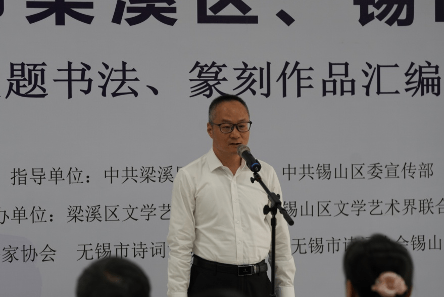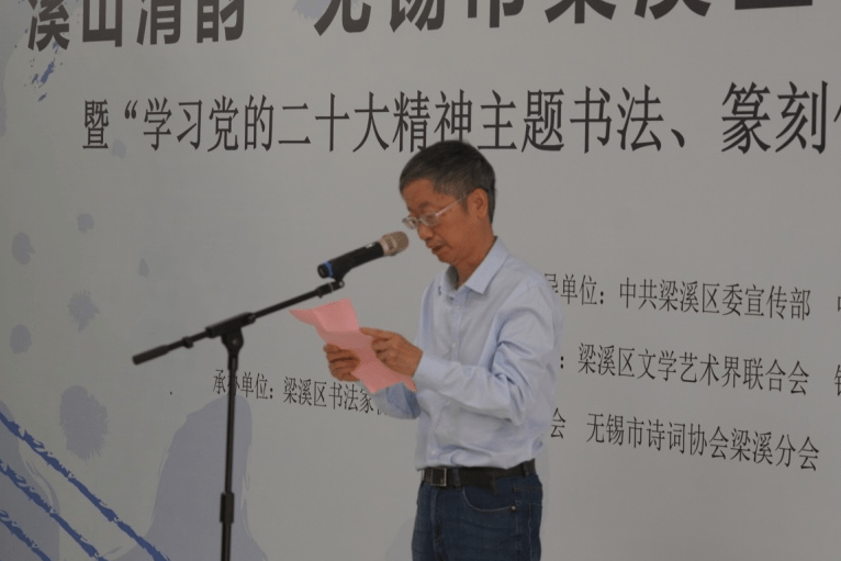 锡山区书协执行主席王剑做总结发言,以五个方面的收获充分肯定了本次联展的成功举办,并希望继续努力,积极响应并落实市区两级文化高质量发展大会的号召,进一步实践笔歌新时代,墨舞好溪山。