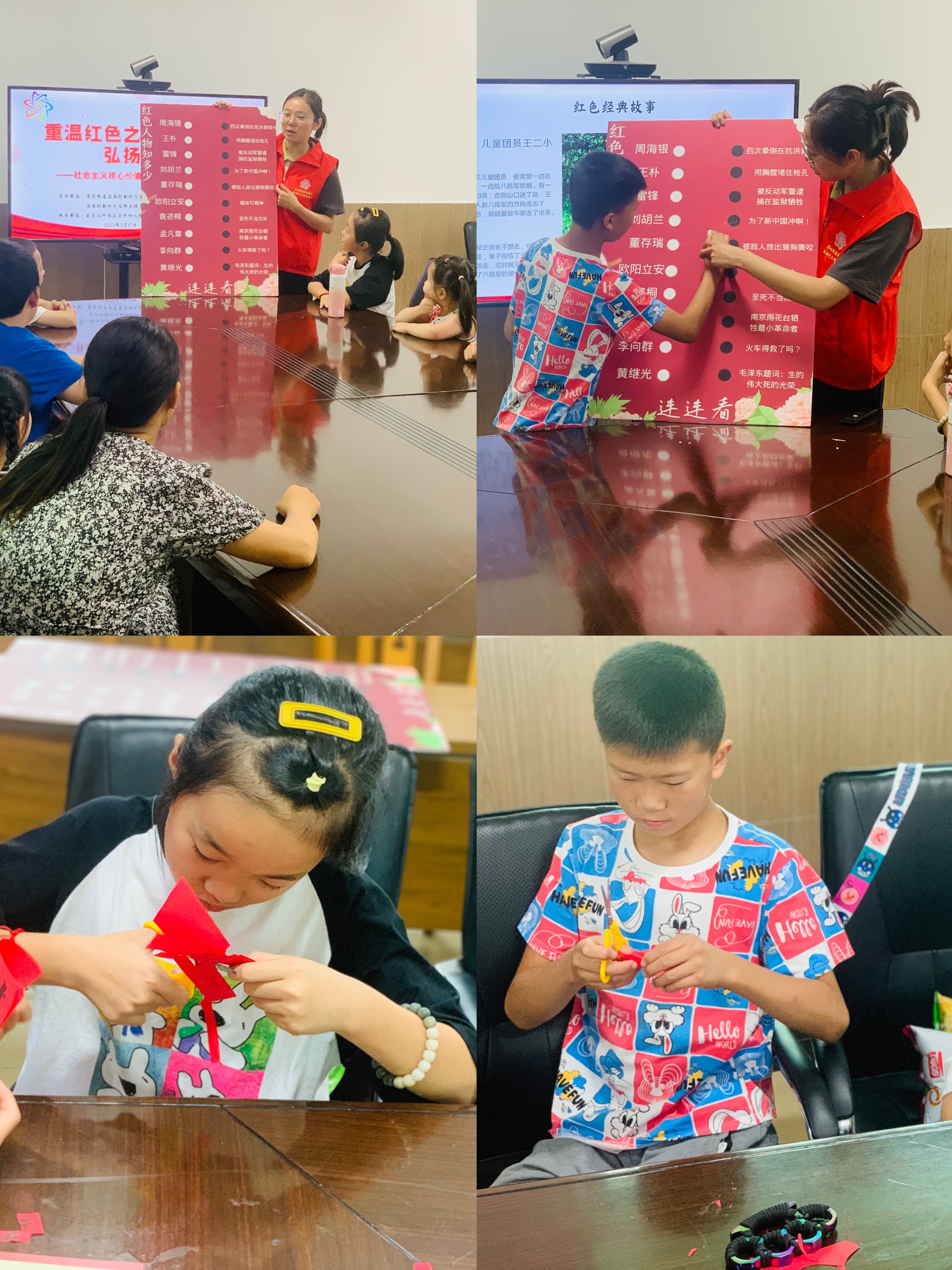 活动最后,志愿者拿出KT板和孩子们一起做红色故事连连看。随后,志愿者带领孩子们一起感受我国非遗文化瑰宝之一剪纸艺术的魅力。志愿者先为孩子们讲述了剪纸的技巧和这项民俗非遗文化背后的深刻意义,紧接着给孩子们发放剪纸材料,在大家共同的努力下一幅《我爱祖国》的剪纸就完成了,孩子们十分开心。