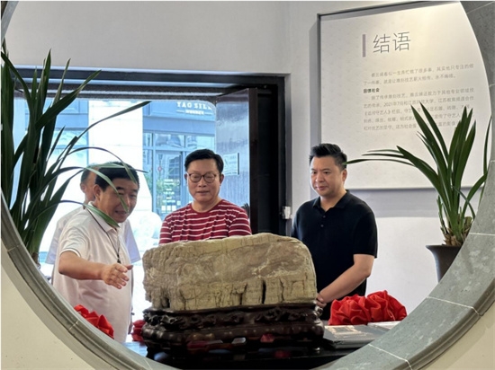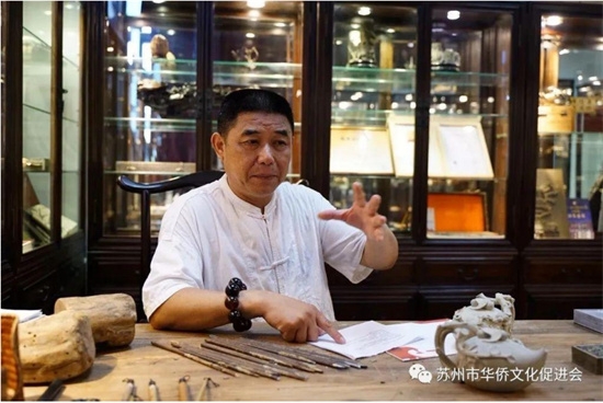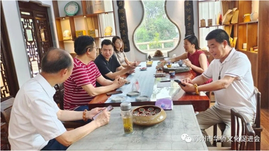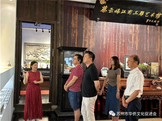 苏州市华侨文化促进会走进蔡云娣江南三雕艺术馆 7 月 15 日,苏州市华侨文化促进会走进蔡云娣江南三雕 艺术馆并开展文化艺术交流座谈会。国际工艺美术大师蔡云 娣、苏州市华侨文化促进会会长张继堂、副会长沈德龙、秘 书长韩露露、苏州市古吴绣工艺有限公司的支部书记徐家根 出席本次座谈会。 蔡云娣江南三雕艺术馆的馆长介绍了蔡云娣是江苏