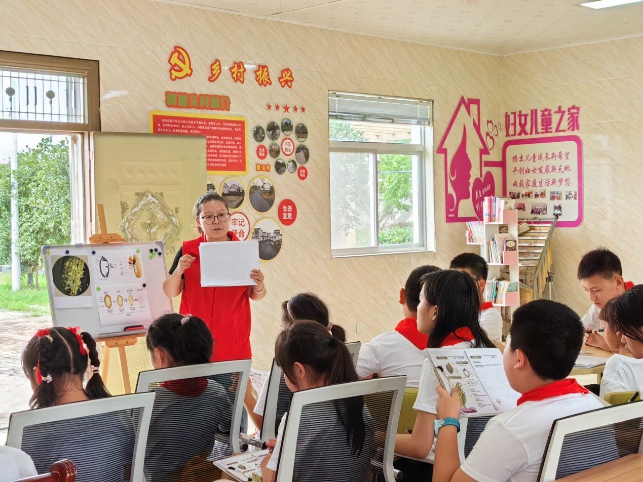 志愿者老师为每位孩子发放了学习手册,在“水稻知多少”环节中,老师通过图片绘声绘色地讲解了水稻花和稻谷籽的结构,孩子们认真聆听。