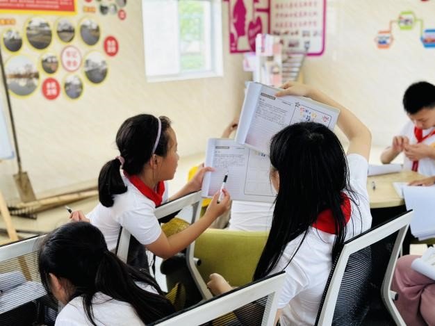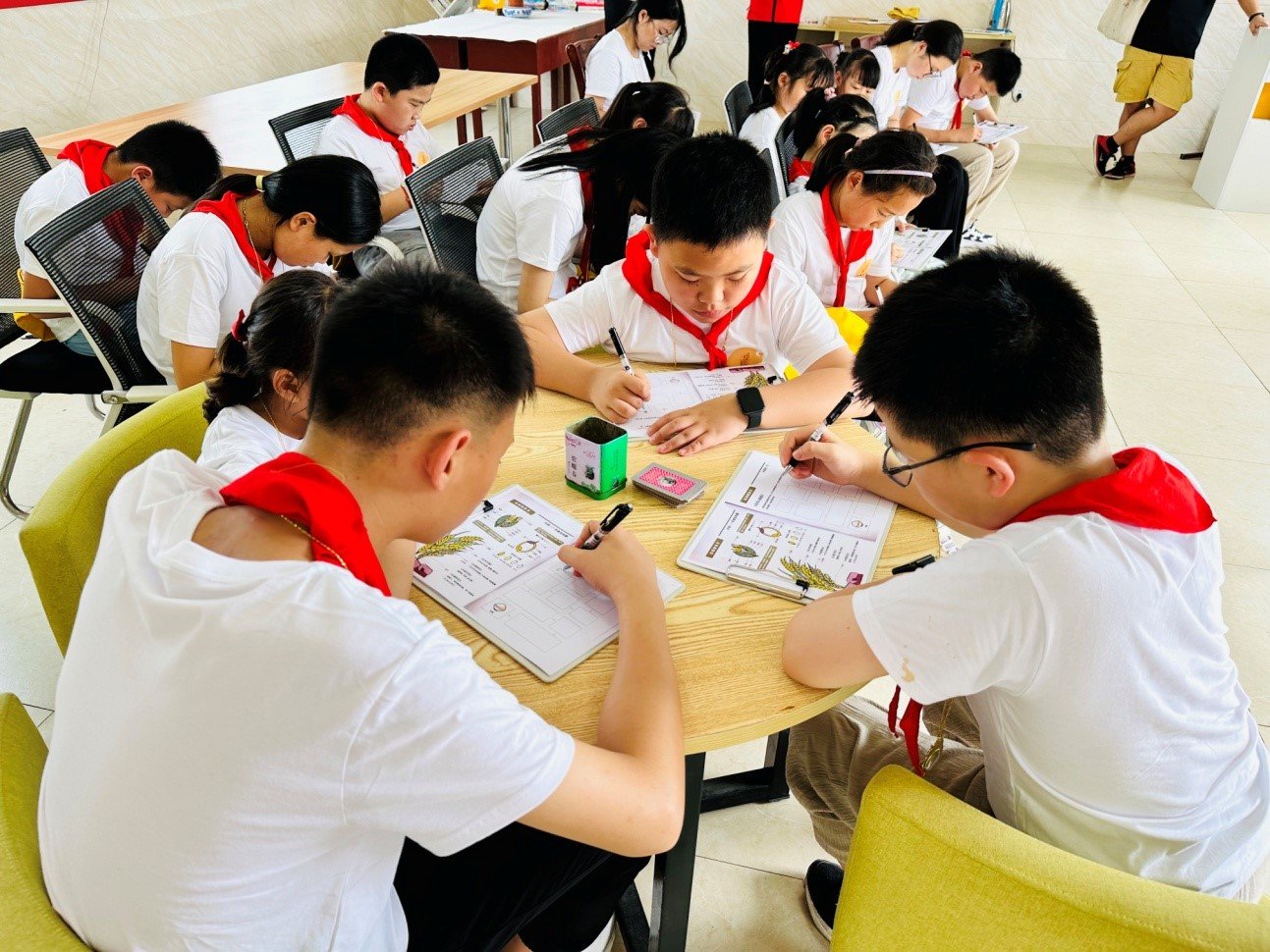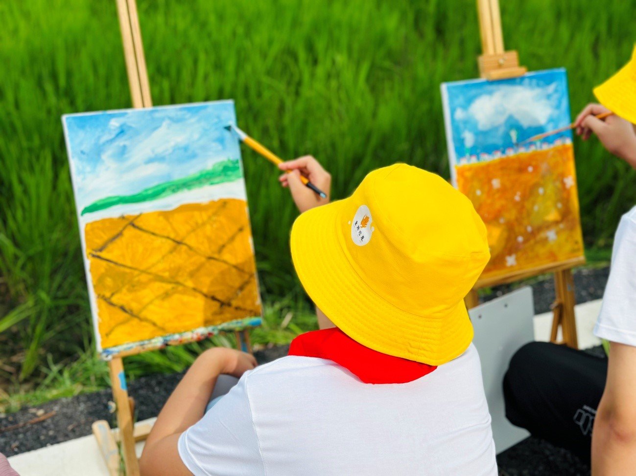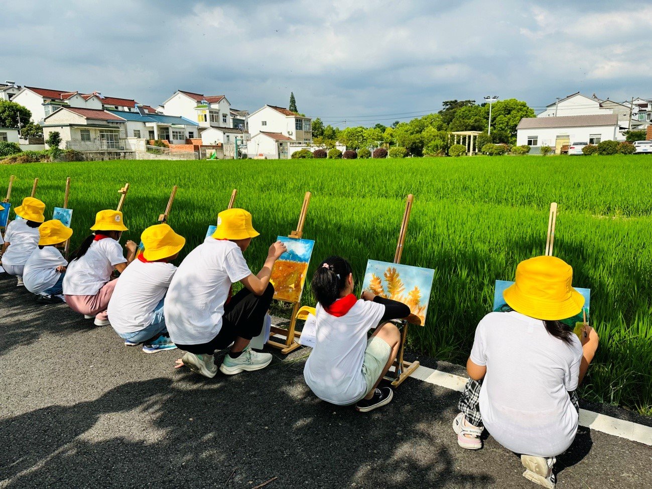 在“谁之盘中餐,粒粒皆辛苦”的示例下,孩子们学习了其他有关于水稻的古诗词,“稻花香里说丰年,听取蛙声一片”,引得大家一阵感叹:“太应景了!”临近活动尾声,大家将上午的画作带到稻田中完善,插上艺术的翅膀,用画笔记录着。