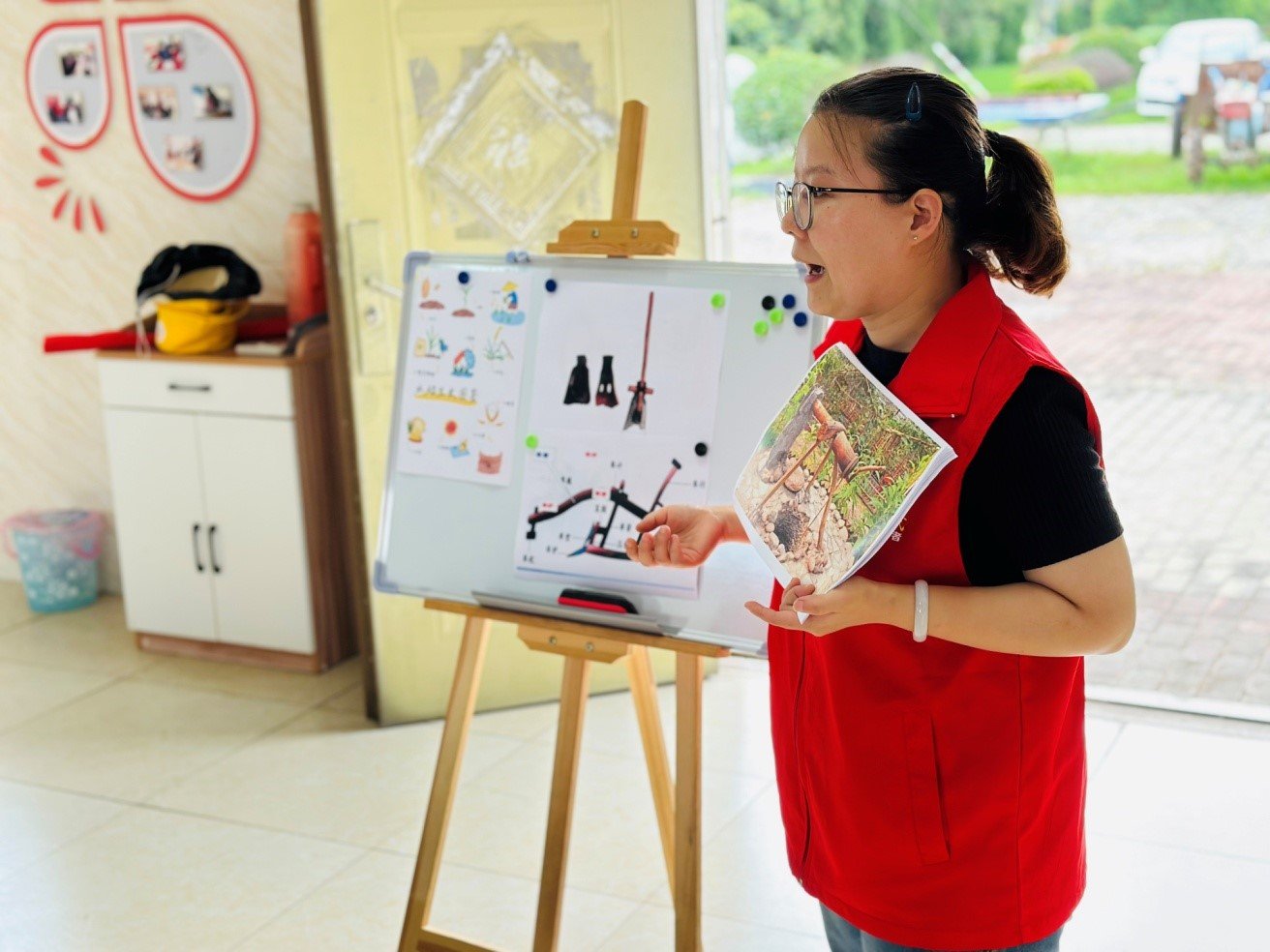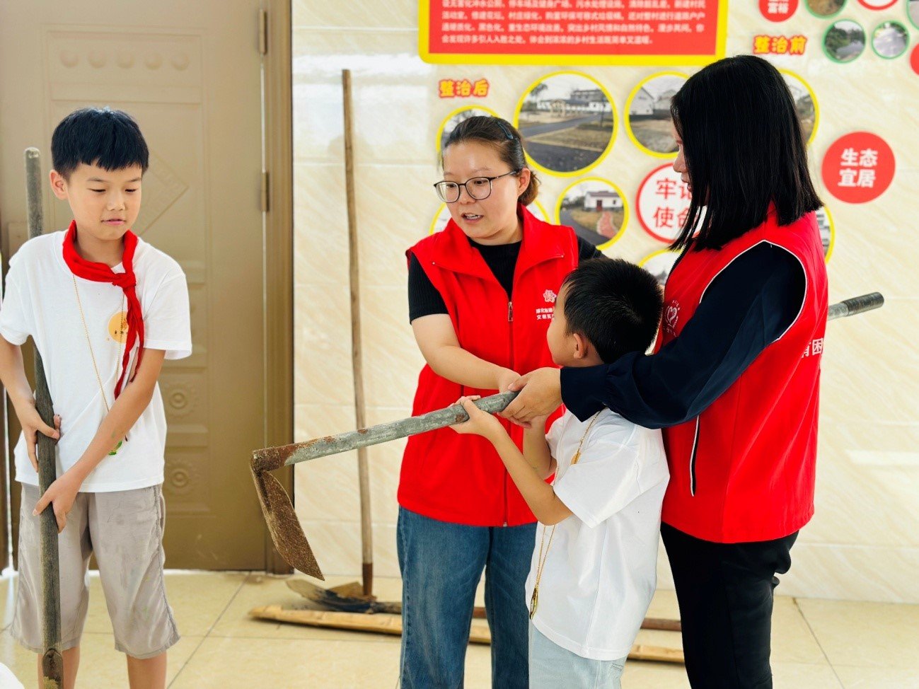 “农具是农耕文明的重要标志,农具帮助农人提高生产效率......”紧接着,志愿者老师为大家具体介绍了耕地工具、灌溉工具和收获工具,还从村民家中借来部分农耕工具,现场进行展示。传统农具的科普,丰富了孩子们对农耕文化的学习认知。