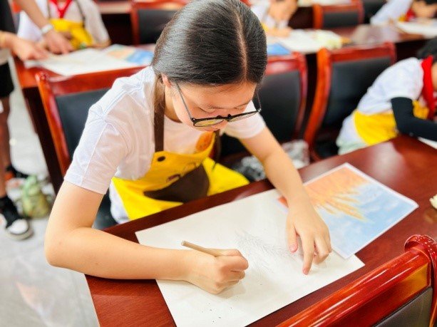 活动开始前,志愿者老师为大家介绍了此次稻田艺术夏令营的具体安排及目标任务,随后给每位参与的小朋友围上围裙,发放了画框、素描纸等绘画材料,大家欣喜地接受了这些装备,准备进入精彩的绘画世界。志愿者老师充分发挥自己的教学素养,为孩子们呈现了一系列的线条艺术,大家通过练习线条的不同变化和用途,培养起对线条的感知和运用能力。随后,老师又讲解了调色、笔刷和绘画技法的基本知识,让孩子们领略到了色彩的奥妙和绘画的多样性。