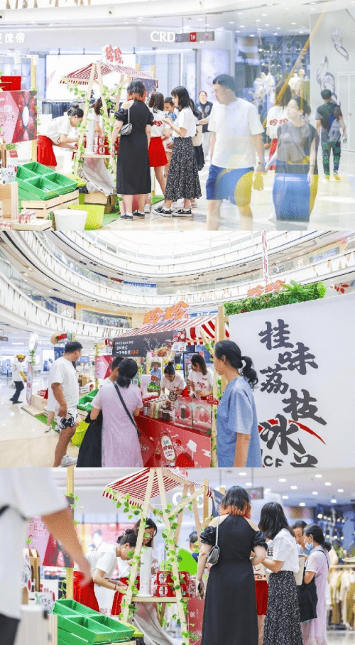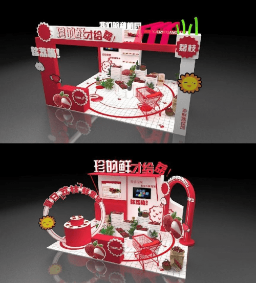 -珍珍快闪店设计稿- 索性大胆尝试,从原材料出发,以荔枝生长环境为参考,还原果农丰收的热闹场景,不仅主题独特,更能让消费者在参与的同时感受来自远方珍珍鲜果产地的亲切,同时,在实景展现上,拿捏设计细节,百分之百将场景呈现。