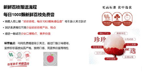 -执行手册部分截图- 不负所望,在历时三十天后,我们带领珍珍走过十多座城市:长春、公主岭、松原、哈尔滨、绥化、齐齐哈尔、佳木斯、沈阳、盘锦、本溪等,顺利完成了106场线上线下推广任务,4000斤荔枝直飞东北,让10万多名消费者品尝到了珍珍的荔枝,同时也让60万多的居民看到了珍珍品牌的鲜果初心,收获了5万多的朋友圈点赞,我们也得到了客户的高度好评。