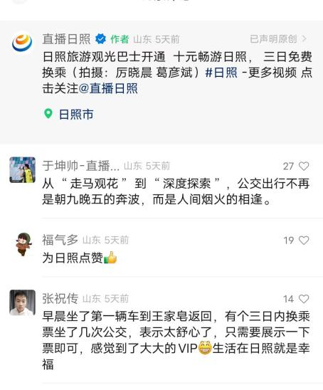 “对我们这样坐高铁出来旅游的来说,不仅出高铁站200米就能坐上一辆旅游观光巴士,还能在市区内免费换乘,挺方便的。”在日照西综合客运站乘车点,来自河北的游客王先生坐上日照旅游观光巴士后高兴地说。
