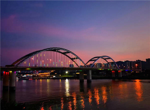 邕江夜色 一道清江穿邑中,朱楼夹岸掩花丛。 夕阳西下彩霞舞,河似绛纱桥似虹。 |