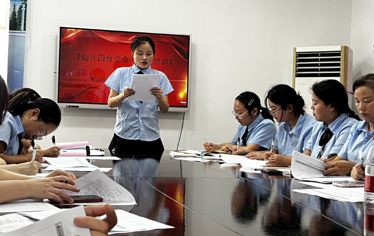 为进一步普及食品安全知识,切实加强幼儿园食堂食品安全管理工作。8月23日,英山县第二幼儿园孔家坊园区组织召开了“食堂食品安全培训会”。园长、教师及食堂从业人员参加了会议。