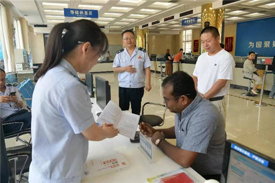 “What can I do for you, sir(先生你好,我可以为你提供什么帮助吗)?” 8月25日上午九时,东光县税务局办税服务厅双语服务岗工作人员陈茹、杨钰静正在在热情地接待来自孟加拉国的外籍人士莫森·比斯瓦斯。经过简短的英文交流,税务干部了解到莫森近日在我县开办了一家进出口公司,于是在中国助力人员的带领下,前来税务局办理税务登记事项。得知这一情况,税务干部非常热情地迅速帮助外籍纳税人办理填表、登记、实名制认证等业务,同时赠送新办纳税人双语礼包,并提供个性化服务,让纳税人应知尽知。仅用了8分钟时间就为这位东光县首位外籍纳税人办理完毕所有业务,莫森激动地举起大拇哥说道:“Thank you so much(非常感谢), 赞!”