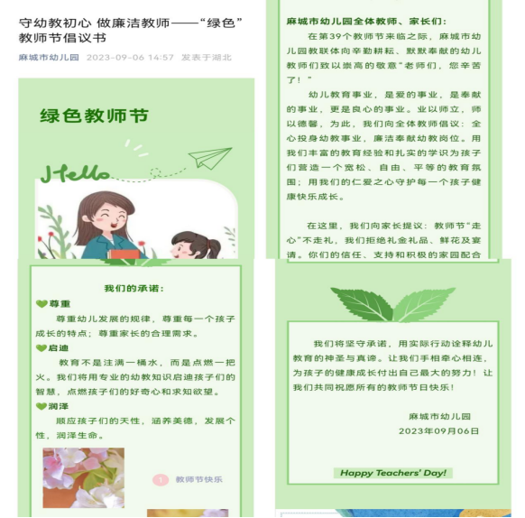 第39个教师节即将到来,为进一步贯彻落实中央八项规定精神,弘扬风清气正、廉洁自律、为人师表的良好社会风气,扎实推进清廉校园建设,湖北麻城市幼儿园面向全体教师、家长发布了“守幼教初心,做廉洁教师”清廉过节倡议书,积极倡导全体教师和家长携手度过一个健康、廉洁的“绿色教师节”。