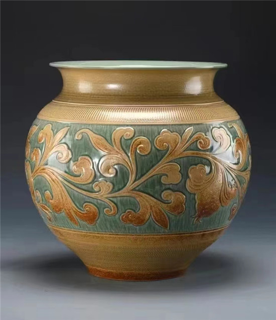“被酒莫惊春睡重,赌书消得泼茶香。”低眉品茶,抬头可欣赏认真工作的丈夫——用审美将工作与生活描绘在同一张画纸上,成了人生别样的爱情诗,这着实让人羡慕不已!我不禁调侃了一句:“工作着的男人是不是最帅?”邵杭平红着脸低头泡茶道:“我哪有李清照、纳兰容若那般的浪漫情愫啊!你看,他天天汗流浃背,天天在吃‘土’呢,我只想为他多分担一点……”一个幽默小插曲,使气氛变得更为轻松,采访更似闺蜜间的茶叙闲聊。 茶室虽小,但颇为雅致。博古架上摆放着邵杭平的近期新作,杯杯盏盏样式繁多。在那些众多款式里最吸我眼球的是一只小巧玲珑的品茗杯,我拿在手上细细打量着,她介绍道:“这是一款双色撞色设计,里面上青釉,外面上传统草木灰釉,中间阴刻纹样填青釉,胎泥薄透,在灯光下可以看到若有似无的光透过来。”哦?好奇的我还真打开手机电筒做起了测验,果真似玉一般通透,一朵“小荷才露尖尖角”显得那样的清纯与灵动。拿它盛茶汤,估计茶主人喝得不仅是茶汤更似在喝一朵荷的甘露和蕴含着的诗情吧? 你一言,我一语。采访过程中,听杭平慢声细语地讲述着,时而激动,时而叹息,激动的是作品得到专家认可和消费者的青睐,叹息的是创作中反复实验都不尽人意。交谈中,她讲起了一件饶有趣的事情:在某一次雕刻的创作上,丈夫用电脑制图,她用手工绘图,看看谁的效果会更好。起初,画出来的都差强人意,唯美主义的她当然不会轻易定稿,一次次推翻重新来,一张张稿纸被自我否定,一轮轮的创意迭代,经过几夜的苦思冥想与创作,图案终于定稿了。但问题又来了,俩人都认为自己的好,僵持不下,于是决定把手工绘图与电脑版制图拿给师父定夺,师父仔细看后说了一句话:“原生才是最好的!”——手绘图更胜一筹。 “要想出满意的作品,并不是一朝一夕就可以完成的,白天静不下心来画画,往往靠通过熬夜创作,在夜深人静的时候,才理出一些头绪来。久而久之,便常常导致失眠、焦虑、生理节律失调……”杭平这样说道。 “你手绘的那张图纸表现在产品上的效果如何?”我有意转移话题问道。 “《灰釉跳刀牡丹瓶》《草木灰釉瑞兽罐》《芭蕉情》分别获得《首届‘中国礼物’创意设计大赛》金奖、银奖、铜奖。”杭平欣然地介绍起来。 听着她娓娓道来的那些成功,看似轻松,奖项背后的那些酸甜苦辣只有她自己知晓。业界对“婺薪缘”作品的认可,是对他们最大的肯定,也让他们在传承创新婺州窑这条路上更加坚定信心。 上个月,“朱泥淬火,草木生辉——婺州窑古今工艺集粹”展在浙江省博物馆西湖美术馆成功举办。22位当代婺州窑陶瓷烧制技艺传承人参与了此次展览,在这些的优秀作品中,邵杭平的新作品《草木灰釉缠枝石榴罐》列位其中。此作品她采用了草木灰釉和青釉两种釉色,并且创新了刻花工艺,制作了复杂的拉丝浮雕刻花工艺,并且用不完全露胎的工艺烧制缠枝花卉石榴纹饰,塑造出斑驳感,是古典与现代感的融合之作。这一作品的展出,得到专家的充分肯定,不少观展者更是驻足欣赏,啧啧称赞。 说到婺州窑,邵家一脉相承的独门技法“邵氏刀法”是不得不令人刮目相看的。在一只小小杯盏或是一个花瓶上,外表光滑脆硬,搬动都得轻拿轻放,而要在上面雕刻作画,而且人物山水、花草虫鸟,样样俱全,其难度是无法想象的。而杭平却能凭借深厚的雕刻功底,舞动画笔刻刀,千里江山,繁花如缀。一件件陶瓷工艺品,经过她的精心修饰,耐受着 1300多度的烈火淬炼,浴火重生,完美呈现在世界上。 说到此处,杭平为我现场展示了“邵氏刀法”。手取一只素坯品茗杯,打量了一番,挑起工具就准备开刻。我心想都不用打草稿的吗?果然身怀绝技的人都是那么胸有成竹的,几刀下来,就在那杯上把一幅“荷花”图案展现出来了。