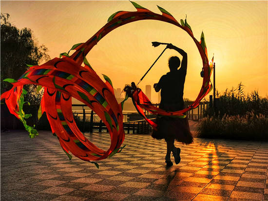 摘要:2023年9月8日是二十四节气白露,淮安市民在钵池山公园晨露中舞龙健身。 桂宝林摄