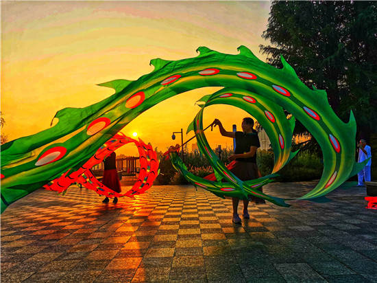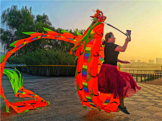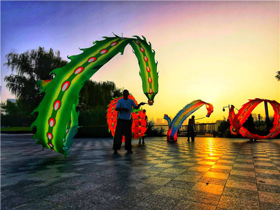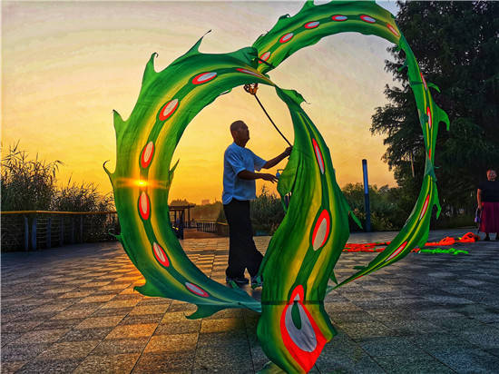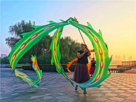 2023年9月8日是二十四节气白露,淮安市民在钵池山公园晨露中舞龙健身。