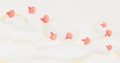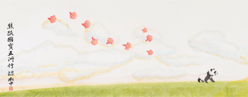 画中稳步前行的大熊猫名叫“中中”,是2022年8月15日在“中国大熊猫保护研究中心卧龙神树坪基地”诞生的雌性大熊猫。她的母亲大熊猫“张卡”是著名的全球首只放归野外的雌性大熊猫“张想”的母亲。今年3月21日农历春分时节,著名熊猫画家、中国美术家协会理事刘中在中国大熊猫保护研究中心碧峰峡基地向中国大熊猫保护研究中心捐赠工作用车,并正式认养熊猫中中。如今,刚刚过完周岁的熊猫中中正追随前人脚步,穿越千年古道,探寻历史文脉。“长安复携手,再顾重千金”,在共建“一带一路”倡议提出十周年之际,天穹中随风飘洒的九星石榴花,指引着熊猫中中启程西安、远行五洲的方向,踏访遍览“一带一路”,续写千年友谊,开辟崭新未来。