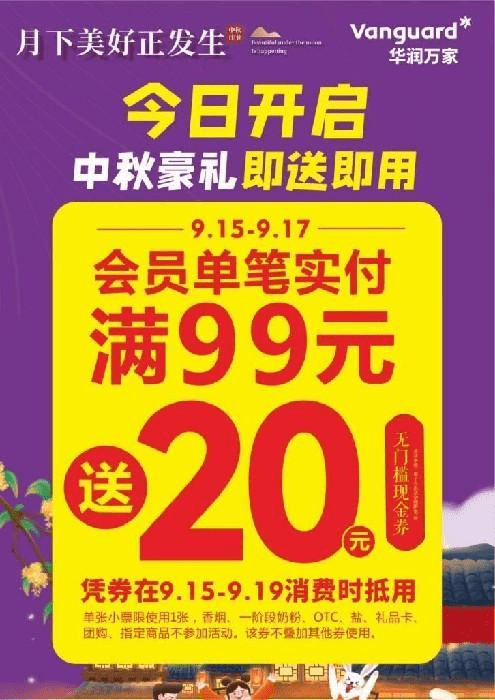 月下美好正发生 中秋豪礼大派发 此次中秋团圆主题促销,华润万家拿出了相当大的优惠力度。据华润万家相关负责人介绍,9月15日至17日期间,会员全场单笔实付满99元送20元无门槛现金券,即送即用,凭券在9月15日至19日消费时抵用,全场促销商品都可用,购买美心鸡蛋卷礼盒、澳牧儿童成长牛奶、闲趣自然原味饼干、儿童积木礼盒等中秋送礼好物更省心。 此外,还有专属于华润万家会员的中秋重磅福利。9月13日至24日,高端名白酒整箱价出售,买一箱送一箱。茅台、五粮液、青花郎和国窖1573……超多品牌参加活动。