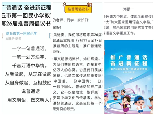 金秋九月,丹桂飘香。在这硕果累累、无限喜悦的季节里,我们迎来了第26届全国推广普通话宣传周活动,沐浴着习习的秋风,品味着浓郁的语言风韵,商丘市第一回民小学结合实际紧扣“推广普通话 奋进新征程”的主题,各年级扎实有序地举办了一系列推普宣传活动。