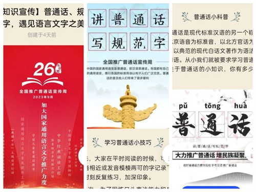 推普不仅仅是一句口号,它已融入日常生活中。走进校园,处处可见推普的标语:我校借助宣传海报向学生推送推普周活动主题,力求让大家受到无声的浸染,营造良好的推普氛围,认识到宣传普及普通话,推行规范字,促进社会文明进步是每个中国人的责任。