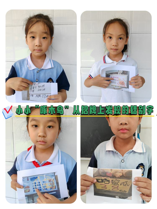 二年级各班的同学们纷纷变身为纠错“啄木鸟”,“啄”出隐藏在文字里的“害虫",用一双双火眼金睛寻找错别字、谐音字等不规范用字,拍照记录并进行纠正。