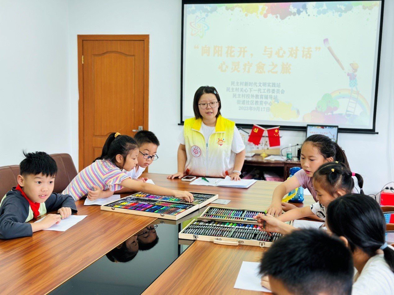 在当下快节奏的生活和学习压力之下,青少年儿童难免容易出现焦虑、抑郁等心理状况, 9月17日,民主村关心下一代、校外教育辅导站联合新活力社会工作服务中心开展“向阳花开,与心对话”心灵疗愈之旅,鼓励青少年儿童以绘画的形式放松身心,并在其中感受自我疗愈,为自己和他人创造一个更加美好的生活环境。