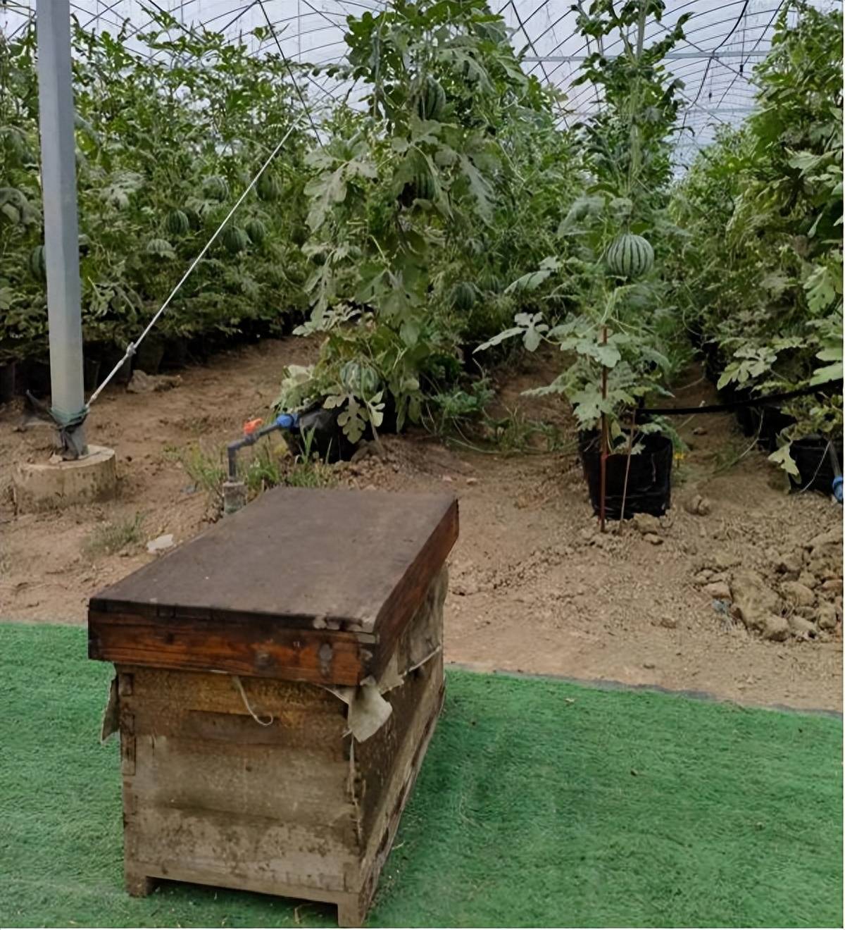 在大棚里还有一个木头箱子形状的物体,那是一箱蜜蜂,你们知道为什么在西瓜棚里养蜜蜂吗? 原来西瓜的种植和许多植物一样需要授粉,传统的西瓜种植都是人工授粉,要求是均匀授粉,但人工很难做到均匀。他们种植的西瓜采取的是蜜蜂授粉,蜜蜂依靠勤劳、认真的劳作,不仅能为西瓜传粉授粉,还能酿出西瓜蜜,恐怕这是人们没有想到的!用蜜蜂代替人工完成给西瓜授粉同时还能收获蜂蜜,真的让人耳目一新。细看瓜棚里那一个个飞来飞去的小小的蜜蜂身影,人们既钦佩碧源公司的新农业技术的研发和使用为新农业产业带来的丰厚收获,又为农业生物科技的创新与使用为人类造福的广阔远景充满期待。