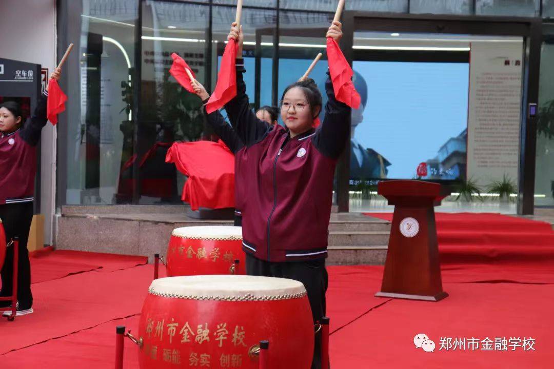 郑州市教育局职成教处处长高苑鑫、郑州市青少年诗书画学会会长王林栓、郑州市金融学校校长都亚萍共同为郑州市金融学校爱国教育基地揭牌。