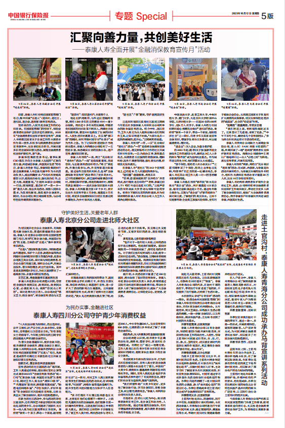 《中国银行保险报》2023年10月12日第5版 日前,泰康人寿积极响应国家监管部门号召,集中开展“五进入”(进农村、进社区、进校园、进企业、进商圈)教育宣传活动。 坚持政治性、人民性是金融工作的初心和使命。在国家监管部门的引领下,保险业消费者权益保护正稳步迈向新阶段。2023年“金融消费者权益保护教育宣传月”,泰康人寿将落实国家关于金融工作的本质要求作为第一要务,积极参与到消费者权益保护宣传教育中,主动承担社会责任,开展丰富多彩的金融知识普及活动,展现金融消费者权益保护新担当、新气象。 泰康保险集团党委书记、董事长兼CEO陈东升向全体泰康人发起的“汇聚向善力量,共建诚信泰康,共创美好生活”的号召,泰康人寿党委书记、泰康保险集团执行副总裁兼泰康人寿总裁程康平作为本次活动负责人,提出明确要求:“各级机构要提高思想认识,提高政治站位,强化政治担当,立足大局,高度重视。”全国共36家分公司统一行动,因地制宜,重点针对“一老一少一新”重点人群,推出多元活动,洞察人民群众需求,为其排忧解难,助其提升金融素养。同时,各分公司发挥区域协同优势,与公司特色服务端资源深度融合。 “进农村”:知识进村户,关爱到个人 地处拉萨河南岸,与布达拉宫隔河相望,拥有1300多年历史的慈觉林村一度十分偏僻。而在近十多年来的发展间,伴随着党和国家的利好政策不断深入,西藏社会面貌日新月异,慈觉林村也抓住了发展的好时机,人民生活开始蒸蒸日上。在实现“富口袋”的同时,如何帮助村民守好“钱袋子”成为当务之急。为了让知识传递更贴合当地群众需求,让他们看得见、摸得着、听得懂、学得会,泰康人寿西藏分公司组织了一支基层工作经验丰富、熟悉藏汉双语的宣教小队,进户宣传,确保知识到家。