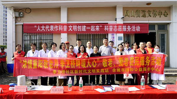 10月17上午,凤山街道季卫桥社区新时代文明实践站、余姚市颐和公益服务中心联合举行“浓情重阳敬老月.季卫桥畔暖人心”敬老、爱老便民服务活动。