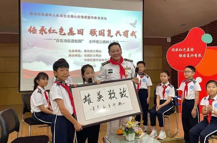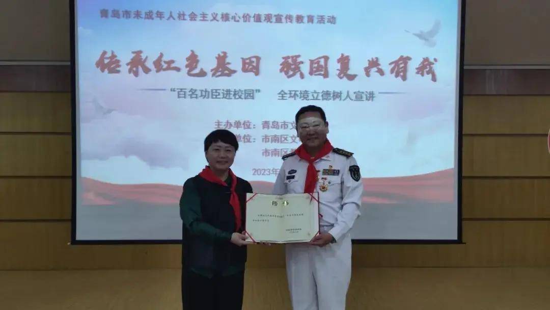 市南区聘请了山东省“优秀军休干部”、青岛市关工委课外教育指导团团长、市南区国防教育指导专家、海军原某部队政委刘长敏为市南区“百名功臣进校园”活动校外辅导员,副局长徐菲为刘政委颁发聘书。