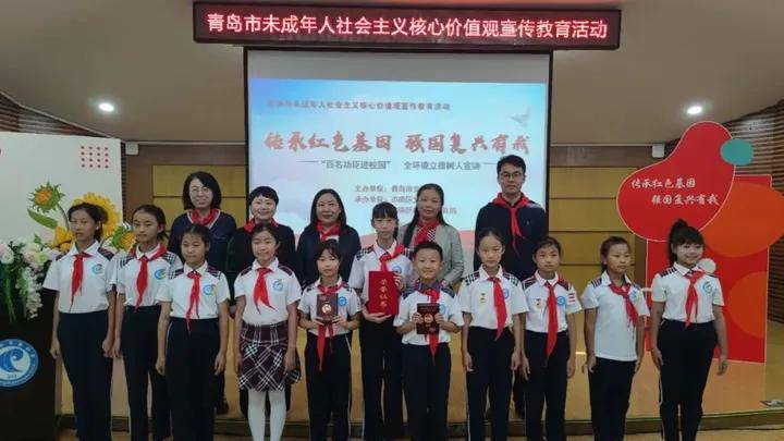 领导、来宾为学校上学期获得红领巾二星章的中队代表、少先队队员、市南区新时代好少年颁发奖章和证书。队员代表徐奕晴发言,她将以新时代好少年这一项荣誉鞭策和激励,在学习生活中不断锻炼、提高自己,为中华民族的伟大复兴,为祖国建设贡献自己的力量。