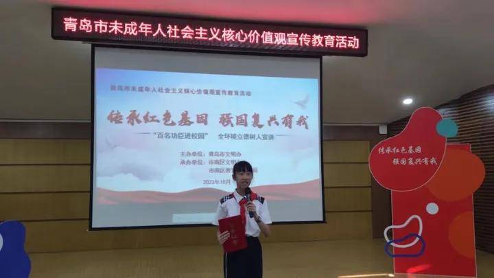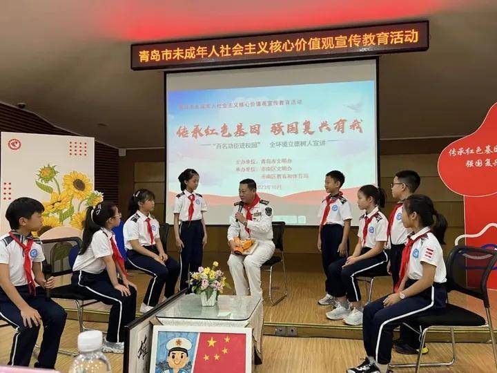 为积极培育和践行社会主义核心价值观,引领未成年人树立正确的世界观、人生观、价值观,10月17日下午,青岛市未成年人社会主义核心价值观宣传教育活动暨“百名功臣进校园”全环境立德树人首场宣讲在青岛太平路小学举行。市南区委宣传部副部长、三级调研员段虹,市南区教育和体育局党组成员、副局长徐菲,江苏路街道办事处副主任曹月洁,市南区少先队总辅导员公真,青岛太平路小学校外辅导员家长代表杨海朋,以及大学路社区的居民代表出席本次活动。 本次活动采取现场参与及网络同步直播两种方式,全校师生、家长以及联合型集团校青岛北京路小学、教育协作校甘肃省定西市永定路小学、甘肃省陇南市宕昌县官鹅藏族小学,线上线下共3000余名师生及家长在线同步参与收看。