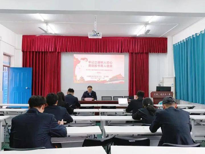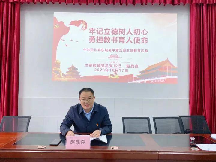 赵战森同志代表中共水寨镇中心学校党总支做主题教育活动讲话: 东城高中作为水寨镇内教育的一支重要力量,在这片沃土上涌现出一批爱岗敬业、教书育人的楷模,今天参会的党员同志承担着东城高中为党育人、为国育才的神圣使命。一个支部就是一座堡垒、一名党员就是一面旗帜,希望各位借助本次党员换届进一步守好教育初心,担好教育使命,在立足本职岗位中,不断锤炼师德,修炼师技,提升驾驭教材、驾驭学生和驾驭课堂的本领,用我们的辛勤汗水、我们的智慧和我们的教育情怀去培养一批又一批能堪当民族复兴大任的有用的栋梁之才。 今日换届选举一切按照程序进行,符合组织程序,选举结果真实有效,我代表水寨教育党总支对今日的换届选举胜利召开表示祝贺,同时借助东城高中党支部换届的契机为大家上一次以“牢记立德树人初心,勇担教书育人使命”为主题的教育活动党课。
