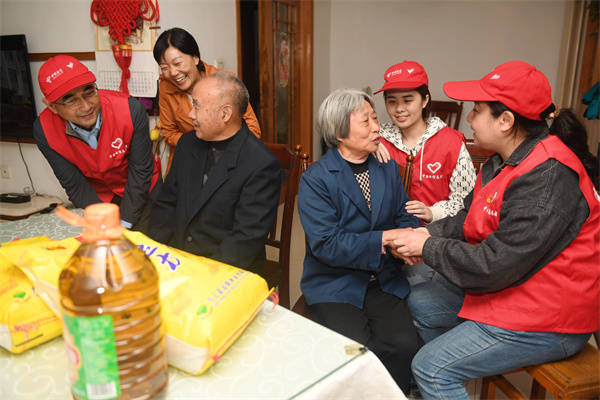 志愿者为老人送去慰问品和浓浓的节日祝福。