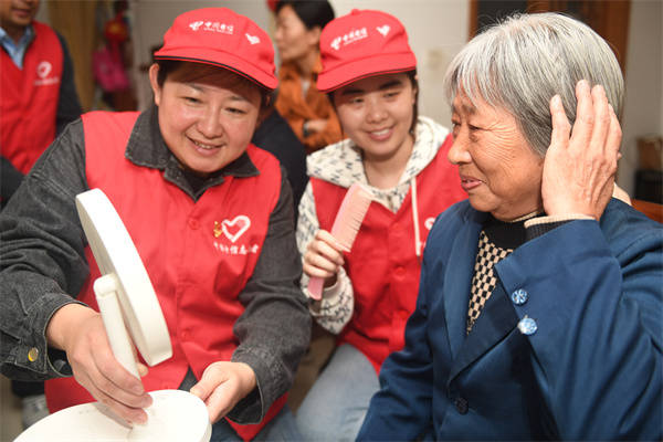 为老人梳头、剪指甲、扫地、聊天共话重阳,营造爱老、助老的浓厚氛围。( 桂宝林 孙信政) |