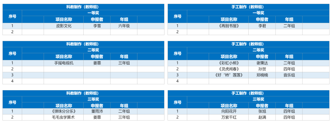 本次教育科技艺术节的评委阵容确实非常强大。校长王辉和副校长韩雄文亲自带队之外,还有陈曦、刘扬、张杨洋等多位主任和李雪、马小虎、付健等多位骨干教师近30余位参加,他们的专业知识和丰富经验,为比赛的评审工作提供非常重要的支持。他们认真负责,不辞辛劳,共评出奖项如下:
