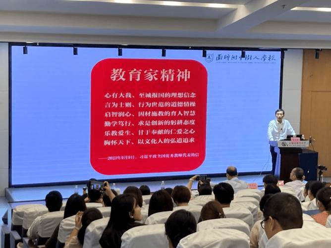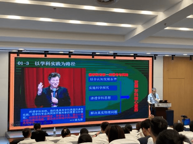 叁 教研论坛 江苏省物理教研员,正高级教师朱文军老师的讲座《学科育人视角下的教研组高质量发展之路》,围绕教育家精神的六个方面展开。一、心有大我,至诚报国的理想信念;二、言为士则,行为世范的道德情操;三、启智润心,因材施教的育人智慧;四、勤学笃行,求实创新的躬耕态度;五、乐教乐学,甘于奉献的仁爱之心;六、胸怀天下、以文化人的弘道追求。 朱文军老师以自身的成长之路启迪学员们潜心育人,勇于担当,甘于奉献。朱老师从2009年带领组内6位年轻老师成立“南京物理教师成长共同体”,开始潜心钻研、身体力行只做一件事即好好观看教学视频到分析论文撰写论文,到后来的读百卷书、送“千”节课、行万里路,直至现在真正拥有坚定的理想信念,由浅入深地给各位学员和各校教研组分别指出发展的方向与路径。 教育是塑造灵魂、塑造生命、塑造人的工作。作为一线的物理教师,不仅是知识的传播者、智慧的启发者,更是精神的熏陶者、人格的影响者和道德的体现者。我们应该有言为士则、行为世范的自觉,不断提高自身道德修养,以模范行为影响和带动学生,做学生为学、为事、为人的“大先生”,成为被社会尊重的楷模,成为世人效法的榜样。