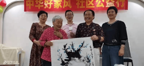 本次活动邀请了有“中国路演之王”之称的萧顺意先生现场主持,萧主持风趣幽默的开场,将老人们逗得哄堂大笑。白鹤咀社区副主任王娟致欢迎辞,中华好家风社区公益行项目执行秘书长谭艺伟致贺。紧接着,人民艺术家、清华大学美术学院客座教授余五一先生现场绘画,几分钟就画出一幅蓝梅图,送给来参加活动年纪最长的90多岁的老奶奶。社区70多岁周光荣老师是一位自学成才的书画家,他老有所依、老有所乐,并且非常热心社区的志愿者工作,他活动现场挥毫写就“中华好家风”赠送给参会者。