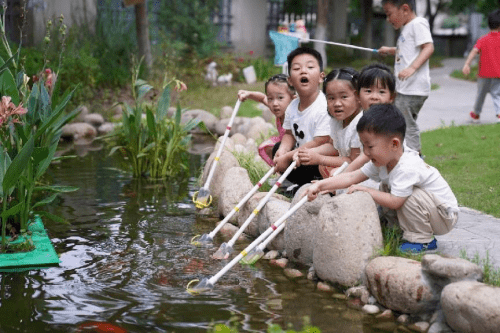 针对以往课程的实践经历,该园整理了“影子和我是好朋友”、“水稻成熟了”等自然探究班本课程方案,老师们从中慢慢悟到了自然探究的教育价值。 在“自然探究”课程建设上,该园鼓励幼儿在探索自然现象中去发现、体验和表达。伴随着深度学习的需求,孩子们将室外小池塘的研究与室内各区域之间联动,将室内外空间进行互通,真正将幼儿园室内外资源有效的联结在一起,共同构成了一个完整的学习环境。