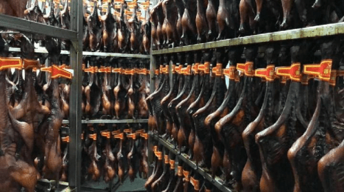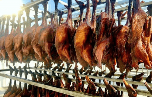 图为新大康生产车间 现代技术的烘房可以替代阳光的晾晒,经过30-60摄氏度间30个小时左右的烘制,杭州酱鸭就基本完成了整个制作工序。但是,真正杭州酱鸭的老味道还得需要阳光下的晾晒,阳光总是传统美食中一道最好的催化剂。