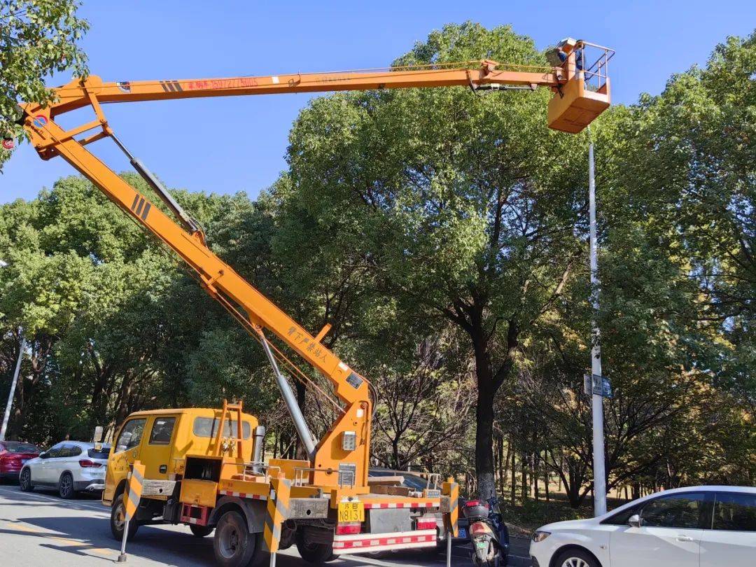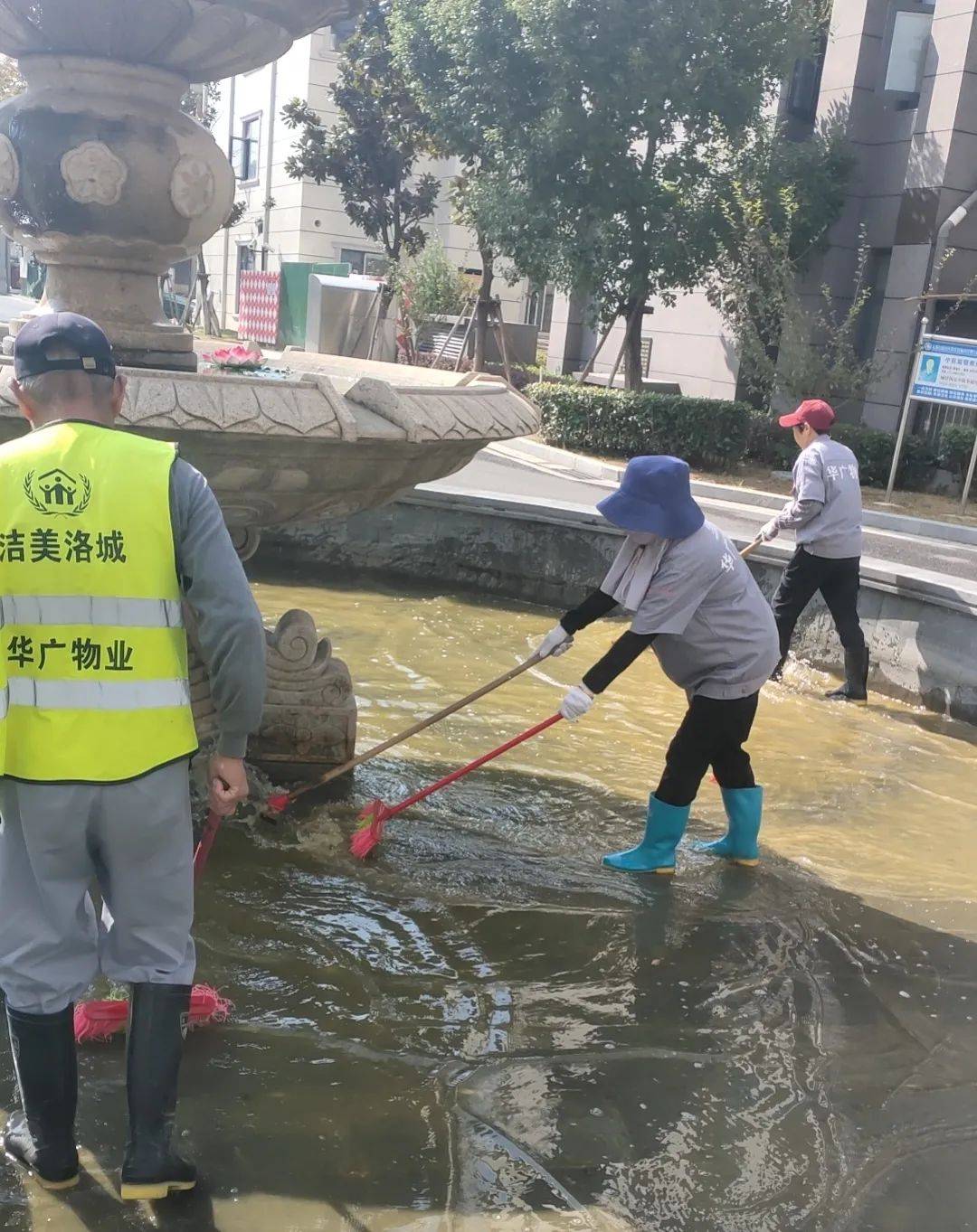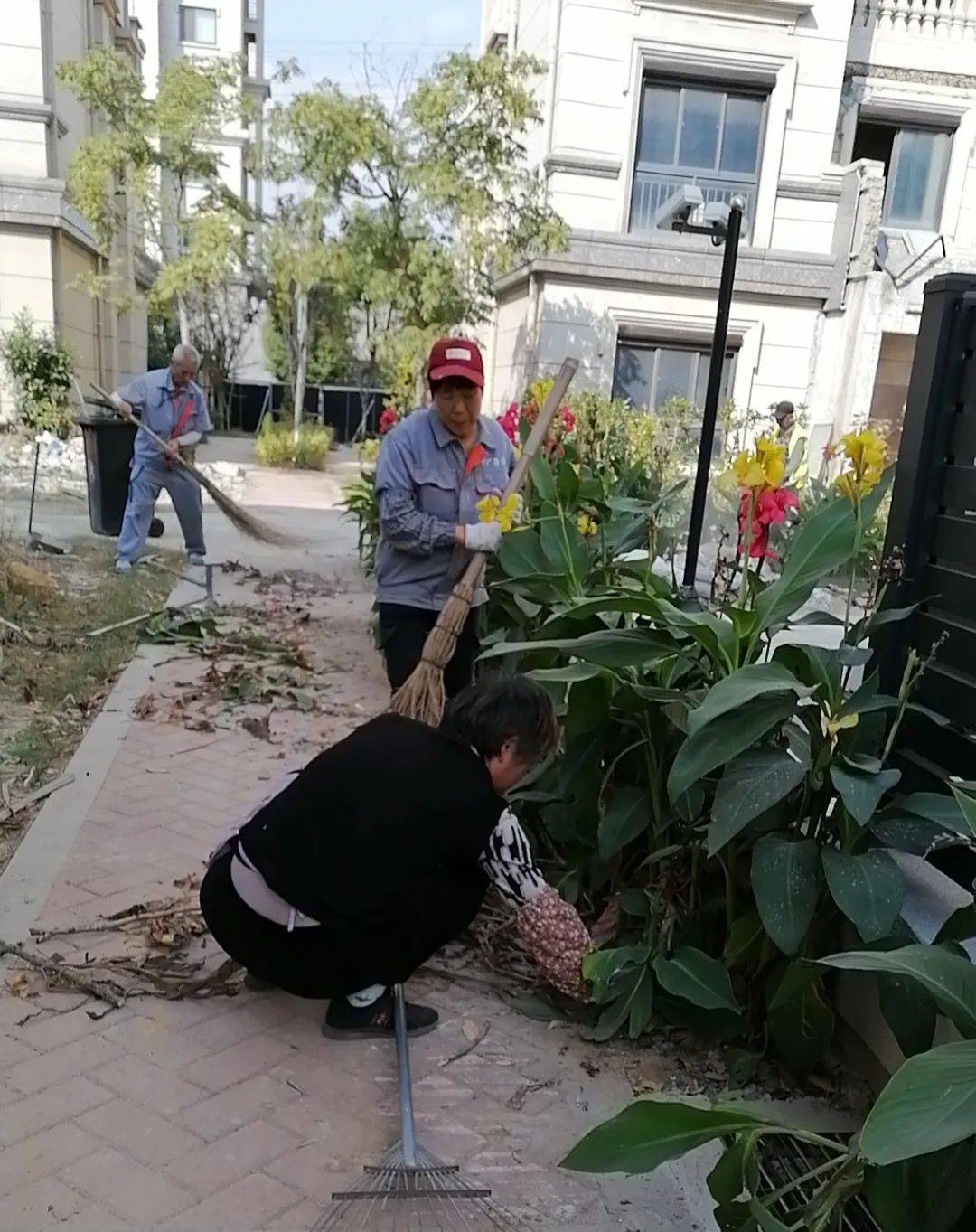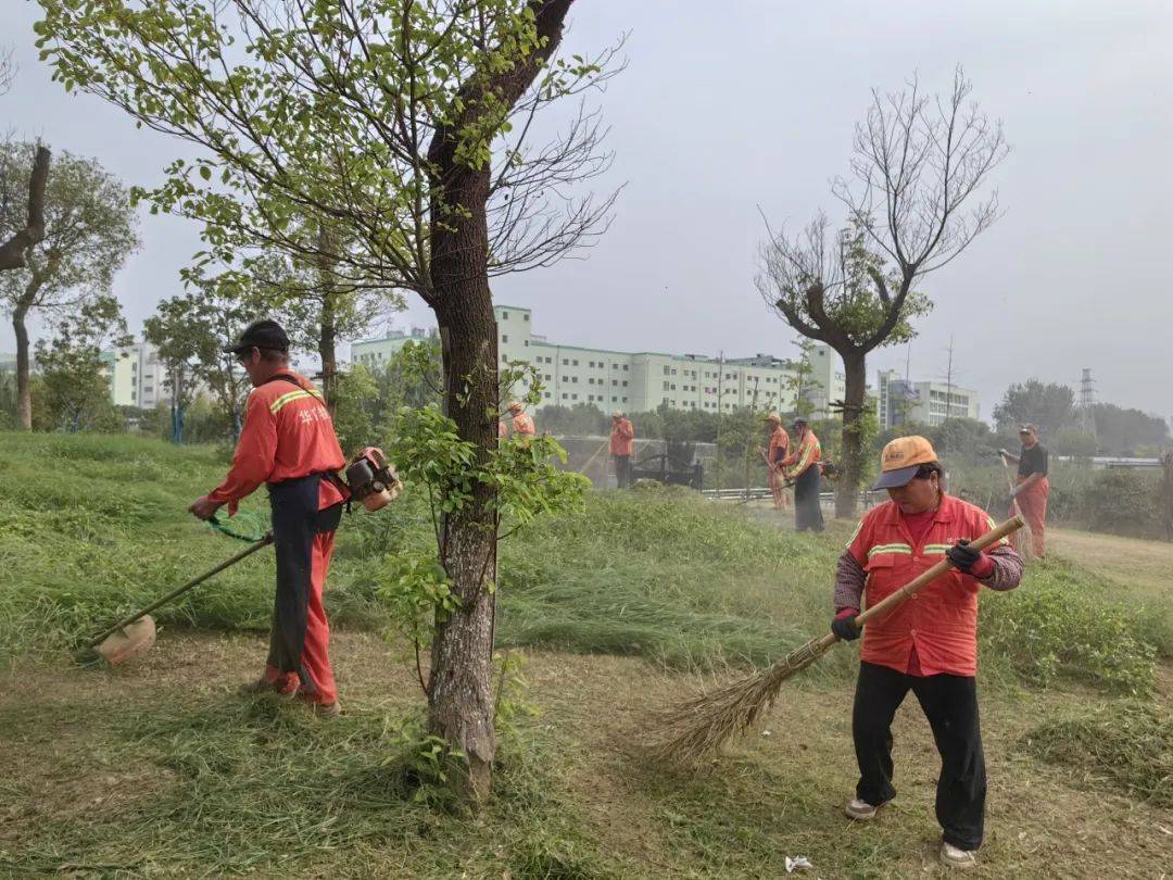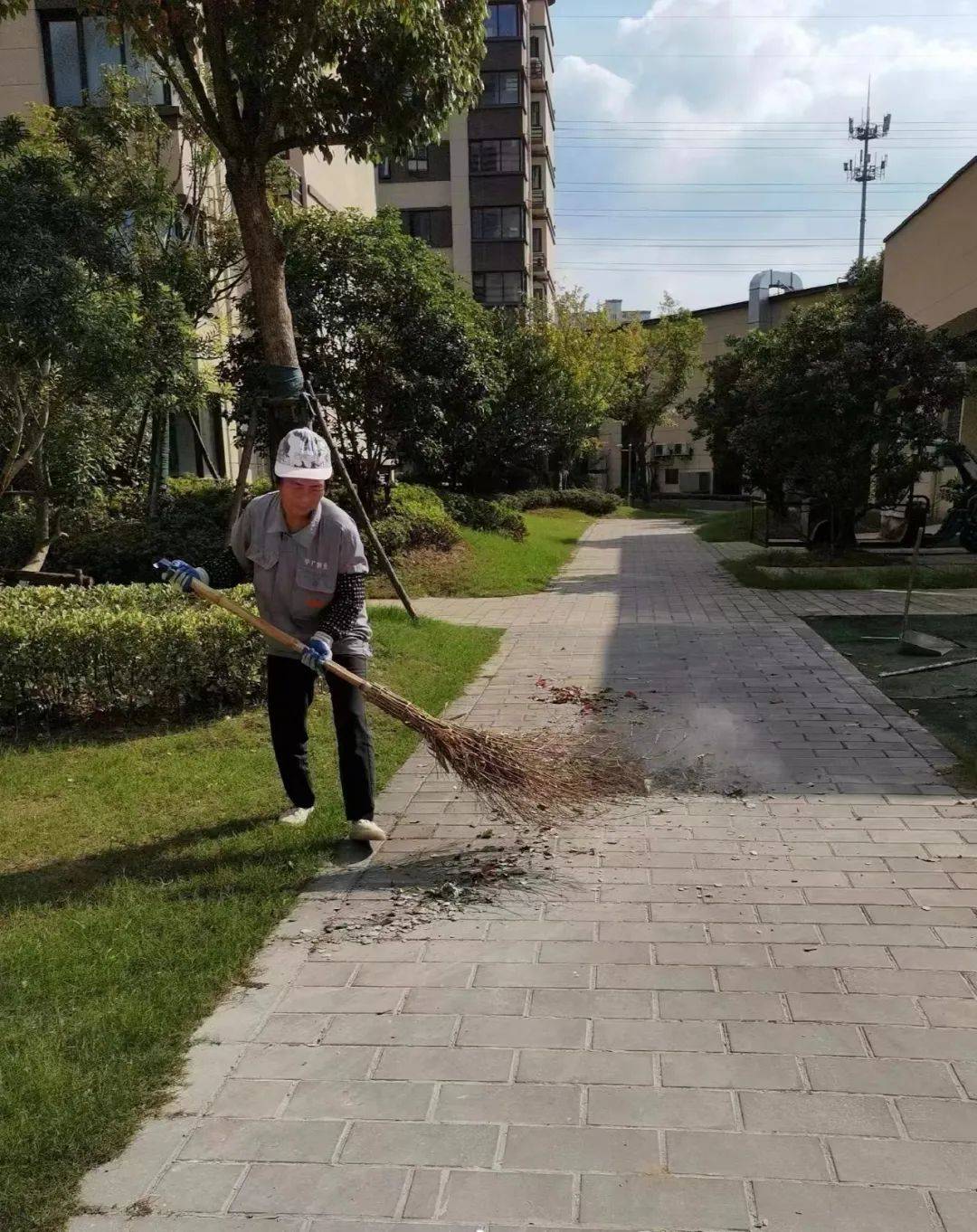 华广物业的绿化工们正忙碌地扫着树叶,他们手持着扫帚,专注而又细致,他们动作迅速有力,仿佛在舞动着一支美妙的交响乐。而树叶在他们的扫帚下翩翩起舞,轻轻飘落在地面上,宛如一场黄金的盛宴,为洛城增添一抹秋日的美好。