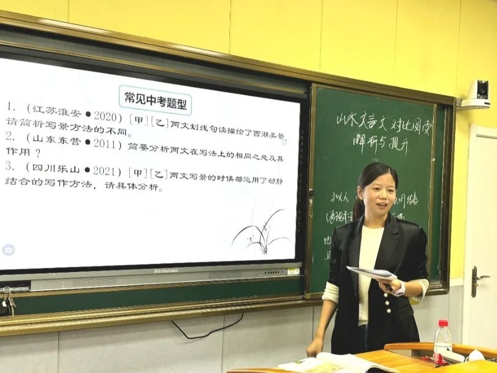 随后,夏乾嘉老师的《课内外文言文对比阅读讲评》将语文的滋味教学推向了一个新高度。教学中,夏老师分别从温故知新:徜徉美景析手法、合作探究:实战演练谋解题、拓展训练:小试牛刀展能力等环节展开,还适时的进行写景描写方法指导。课堂上,师生互动、小组合作、读写结合、讲评议结合等充分展现语文课堂教学的魅力。