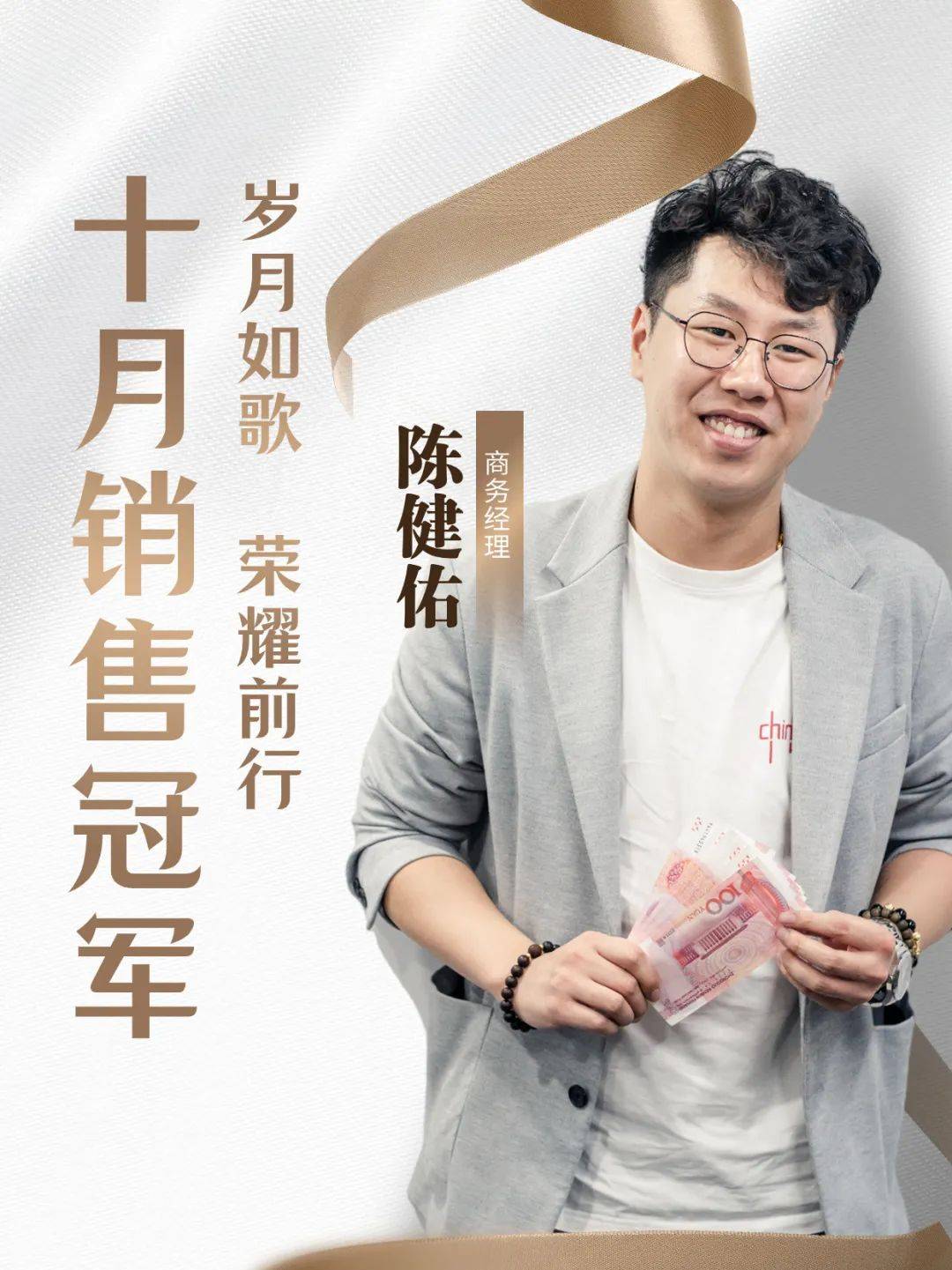 十月销售冠军:陈健佑 我们要向十月的销售冠军——陈健佑,表示最诚挚的祝贺!他的出色表现是我们大家的骄傲,也是我们共同的榜样。只有敢闯才会有出路,他在工作中有创新精神,勇于开拓思路,善于利用各种灵活的思路和办法,创造性地解决和处理工作中存在的各项难题,让我们向他学习,互帮互助,共同提高! 结语 深耕细作行不怠,奋楫笃行启新程。2023年第四季度已经过去三分之一,2024年奋斗的战舰即将启航!让我们努力,将每一帧拼搏的瞬间化为充实的时光,以勇挑重担、不断破局的决心扬帆起航,勠力同心!无论前方有多少风浪,只要我们紧密团结,共同前行,必定创造更加辉煌的明天!